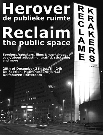 The first Reclamekrakers event will be held on wednesday 20th of December in De Fabriek, Rotterdam. The evening is dedicated to anti-advertising art/activism in general and billboard-hacking in particular with presentations, films/docs and workshops.