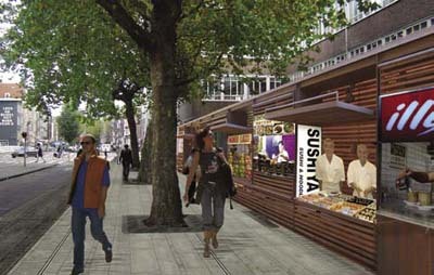 Oud-West positieve economische effecten kan hebben. Het voorstel, dat is uitgewerkt door de architect Yuri Werner, verbindt de winkelfuncties van Elandsgracht en Kinkerstraat. Deze straten liggen weliswaar in elkaars verlengde maar vormen op dit moment geen eenheid. Ter hoogte van de Appeltjesmarkt wordt de entree naar het Centrum bepaald door een afwijzende, onherbergzame sfeer. Van een prettige loop- en fietsroute is hier geen sprake. Wij zijn ervan overtuigt dat de Appeltjesmarkt zonder al te grote ingrepen kan veranderen van anticlimax in een prettige openbare ruimte; een gebied dat stadsdelen verbindt in plaats van scheidt.