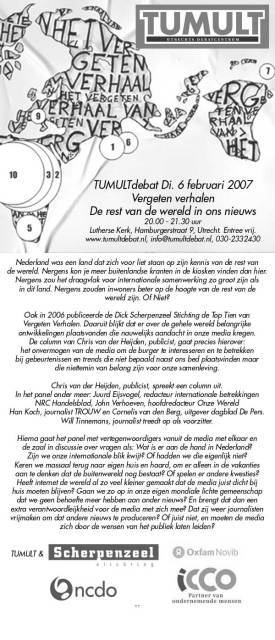 Ook in 2006 publiceerde de Dick Scherpenzeel Stichting de Top Tien van Vergeten Verhalen. Daaruit blijkt dat er over de gehele wereld belangrijke ontwikkelingen plaatsvonden die nauwelijks aandacht in onze media kregen. De column van Chris van der Heijden, publicist, gaat precies hierover: het onvermogen van de media om de burger te interesseren en te betrekken bij gebeurtenissen en trends die niet naast ons bed plaatsvinden maar die niettemin van belang zijn voor onze samenleving.  DINSDAG 6 februari VERGETEN VERHALEN - De rest van de wereld in ons nieuws 20.00 – 21.30 uur. Lutherse Kerk, Hamburgerstraat 9, Utrecht. Entree vrij. Chris van der Heijden, publicist, spreekt een column uit. In het panel onder meer: Juurd Eijsvogel, redacteur internationale betrekkingen NRC Handelsblad, John Verhoeven, hoofdredacteur Onze Wereld , Han Koch, journalist Trouw en Cornelis van den Berg, uitgever dagblad de Pers. Will Tinnemans, journalist, treedt op als voorzitter. Ook in 2006 publiceerde de Dick Scherpenzeel Stichting de Top Tien van Vergeten Verhalen. Daaruit blijkt dat er over de gehele wereld belangrijke ontwikkelingen plaatsvonden die nauwelijks aandacht in onze media kregen. De column van Chris van der Heijdengaat precies hierover: het onvermogen van de media om de burger te interesseren en te betrekken bij gebeurtenissen en trends die niet naast ons bed plaatsvinden maar die niettemin van belang zijn voor onze samenleving. Hierna gaat het panel met vertegenwoordigers vanuit de media met elkaar en de zaal in discussie over vragen als: Wat is er aan de hand in Nederland? Zijn we onze internationale blik kwijt? Of hadden we die eigenlijk niet? Keren we massaal terug naar eigen huis en haard, om er alleen in de vakanties aan te denken dat de buitenwereld nog bestaat? Of spelen er andere kwesties? Heeft internet de wereld al zo veel kleiner gemaakt dat de media juist dicht bij huis moeten blijven? Gaan we zo op in onze eigen mondiale lichte gemeenschap dat we geen behoefte meer hebben aan ander nieuws? En brengt dat dan een extra verantwoordelijkheid voor de media met zich mee? Dat zij weer journalisten vrijmaken om dat andere nieuws te produceren? Of juist niet, en moeten de media zich door de wensen van het grote publiek laten leiden? TUMULT & Dick Scherpenzeel Stichting www.hetvergetenverhaal.nl en www.scherpenzeel.org Website: http://www.tumultdebat.nl |