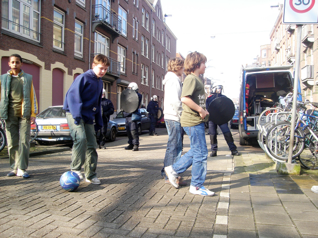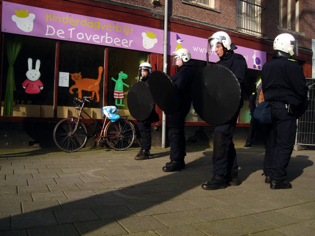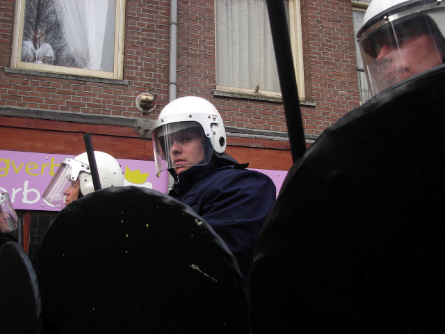 Dinsdag 13 maart 2007 ontruimt een colonne ME met groot materieel weer een aantal kraakpanden, waarvan de bewoners het niet eens zijn met de ontruimingsreden.  foto 13/03/07 ME schermt het pand aan de Bilderdijkstraat af voor publiek.  Deurwaarder bij Bilderdijkstraat onder bescherming van ME  Spuistraat. Pand is direct dichtgespijkerd na ontruiming. Achtergrondinformatie: De Spuistraat 241-243 wil Ymere onttrekken aan sociale huur om het, na verbouwing, op de vrije markt duur te verhuren. Het gaat nota bene om eenpand dat monumentstatus heeft verkregen op basis van het feit dat het 1 van de eerste sociale huurpanden in het centrum van Amsterdam was. De Bilderdijkstraat 82 is bekend als de voormalige Coffeeshop Tomorrowland, die gesloten werd omdat er harddrugs en vuurwapens gevondenwerden, het pand wordt teruggeven aan de toenmalige en huidige eigenaar, crimineel en vastgoedspeculant Nicolaas Sandmann, die om fiscale en jurdisiche redenen officieel op Bonaire woont. De bovenetages van Haarlemmerdijk 47-49, een rijksmonument dat 16 jaar stond te verkrotten. Bouw- en woningtoezicht wilde twee jaar terug de bouwvergunning intrekken. De eigenaar, huisjesmelker Ypma, probeert al jaren de kapperszaak op de begane grond weg te pesten om de bloemenzaak van z'n dochter te kunnen uitbreiden. Zelfs als dat zou lukken, dan moet van bouwtoezicht eerst de fundering worden hersteld voordat aan de verbouwing begonnen kan worden. Het zal dus leeg blijven staan. Zaagmolenstraat 2 is eigendom van s' Winters Binnen, een bedrijf dat tot de kring van de erven Endstra behoort. Het pand werd uitgepond en s'Winters Binnen wacht op het “geschikte moment” om het goed met voldoende winst te kunnen verkopen. Omdat dat goede moment maar niet kwam, werd het na jaren leegstand gekraakt. Nu wordt het weer ontruimd omdat de eigenaar gemakkelijker in staat is om met het pand te speculeren als het leeg staat. De legitimiteit van zijn bedoelingen werden door de rechter namelijk niet getoetst. |