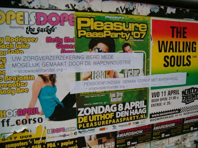 Nu de wapen handel juist zo in de actualiteit is, is het een goed moment op uit te pakken met een plakactie tegen de handel in wapens. Met name de pensioenfondsen kwamen onder vuur te liggen. Ook kwam de rol van banken bij het finacieren van clusterbommen aan de orde.     Afgelopen week en komende weken wordt er hier en daar geplakt in de strijd tegen de wapenindustrie. In een meer rechtvaardige wereld is er voor oorlogvoeren naast hogersnood geen plaats! De volgende leuzen werden geplakt: - EEN KERNRAKET VAN UW PENSIOEN - PENSIOENFONDSEN DENKEN VOORUIT MET WAPENHANDEL - WIJ VAN DE BANK DRAAIEN ONZE HAND NIET OM VOOR EEN PAAR CLUSTERBOMEN MEER OF MINDER - UW ZORGEVERZEKERING WERD MEDE MOGELIJK GEMAAKT DOOR DE WAPENINDUSTRIE - TOURNIQUETTES SPEKKEN DE KAS VAN THALES WAPENPRODUCENT |