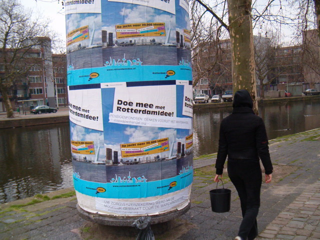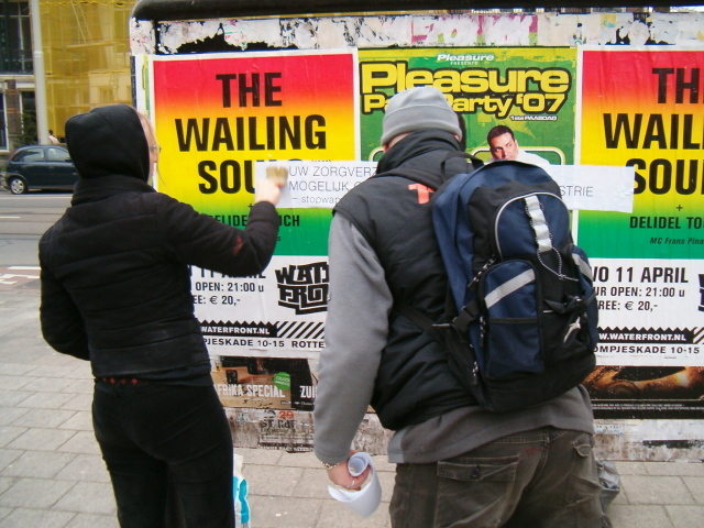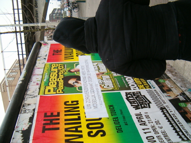 waar vond deze geweldige plakactie plaats? In Rotterdam wellicht? (maak ik op uit de affiches waar ze overheen zijn geplakt) | |
