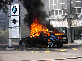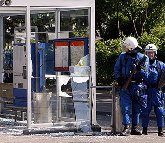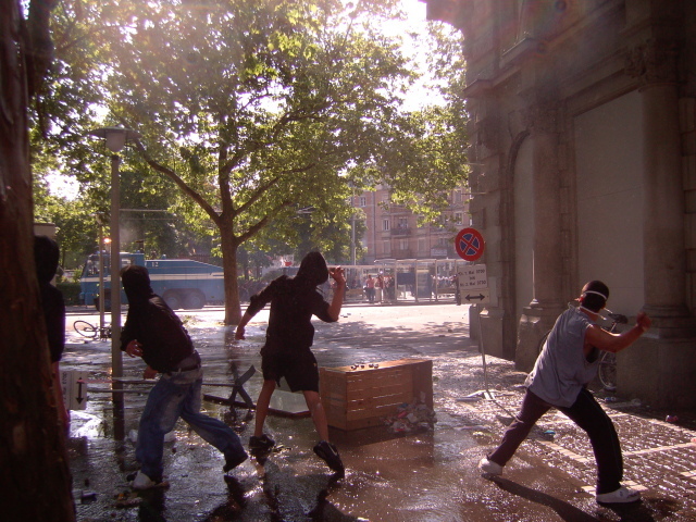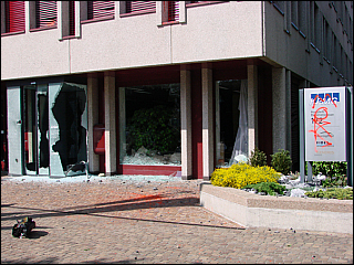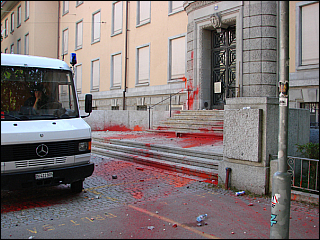 Switzerland, Zürich: After many hours of streetfighting between protesters and police, people began to attack banks, private companies, courts, police stations and cars of the rich with fire bombs and paint bombs. countless windows were smashed.