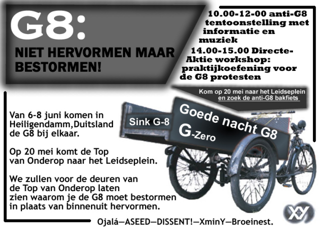 Ter begeleiding van de Top van Onderop zal er in de omgeving een vette expositie over de criminele activiteiten van de G8 gehouden worden, met om 14.00 uur een openbare workshop directe actie en blokkeren. Komt allen! De flyer zegt het allemaal. De expo met toelichtingen begint om 10.00 uur en er komt nog meer achtergrondmateriaal ter plekke over de onderwerpen: sojalandbouw, migratie en schulden (en G8). Om 14.00 uur workshop G8-blokkeren Het is natuurlijk allemaal gratis... | | Blokkade Oefenen | Prikkel - 20.05.2007 18:43