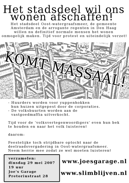 Op 21 mei 2007 hebben wij, de bewoners en gebruikers van het kraakpand aan de pretoriusstraat 28, een oprotbrief van de eigenaren ontvangen. De heren Segaar, Van de Laar en Klomp, allemaal vastgoedboeven en/of geldzwendelaren uit de noordhollandse provincie willen dat wij 'binnen 14 dagen' plaats maken voor hun verbouwingsplannen tot onbetaalbare appartementen. De geschiedenis van het pand en de tegenwoordige omstandigheden doen echter vermoeden dat niet eens deze asociale plannen op korte termijn uitgevoerd zouden worden, maar dat de kraakgroep (terecht!) de zoveelsde 'waardestijging' in de weg staat. Dit is alweer de tweede oprotbrief in de roerige geschiedenis van PS28. De laatste keer (2004) wilde nog drugs- en mensenhandelaar Joe McCarthy dat we voor speculatie ons huis moesten verlaten. Gezien het feit dat we toen al meer bewijzen van ZIJN dubieuze activiteiten naar buiten hebben gebracht dan hij kon hebben, kwam het niet eens tot een rechtzaak. Inmiddels hebben wij deze figuur zijn zaken afgesteld en zit justitie achter zijn broek aan. Het stadsdeel heeft een al verleende bouwvergunning weer ingetrokken op basis van de anti-maffiawet BIBOB. Wel hebben wij ons kraakcafetje naar hem vernoemd: Joe's Garage. Mede daarom moest hij zijn pand verkopen, en zo kwam de pretoriusstraat 28 in handen van zijn stromannen Segaar, Koch, van de Laar en Klomp terecht. Wel hebben we de gemeente herhaaldelijk erop gewezen dat er niet echt sprake is van een nieuwe situatie en toch is aan deze figuren 8 maanden geleden opnieuw een vergunning verleend. Sindsdien word erover in raadscommissies, bezwaarprocedures en zelfs bij het landelijk bureau BIBOB gepiekerd, maar door de lafheid van het stadsdeel Oost-Watergraafsmeer is de vergunning in stand gebleven. Gezien het feit dat er steeds meer informatie naar boven komt en het criminele netwerk langzamerhand voor iedereen zichtbaar wordt, krijgen de eigenaren het langzamerhand toch wel een beetje benauwd. De genoemde oprotbrief komt namelijk terwijl er allerlei onderzoeken tegen hun bezig zijn. De laatste bezwaarzitting (tegen de nieuwe bouwvergunning) was een soort slachtpartij, waar hun rol als stromannen van de verdachten in de strafzaak tegen de voormalige eigenaar, goed uit de verf kwam. Zou het kunnen dat dit dreigement met een ontruimingszaak een soort paniekreactie is? Het laaste woord in deze is in iedere geval nog niet gesproken: niet in de raadszalen, niet in de gerechtsgebouwen, en zeker niet in de buurt of op straat! Oproepen tot protest en als het niet anders kan tot verzet zullen volgen, stay tuned! de oprotbrief