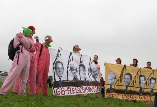 De 8 bevrijdde varkens van de gigantische varkensfabriek in Wendisch Priborn doken op tijdens de demonstratie in de Duitse stad Rostock op de derde juni. De eerste juni waren ze bij hun stal verwisseld met de G8 leaders.