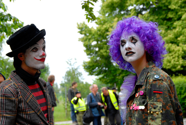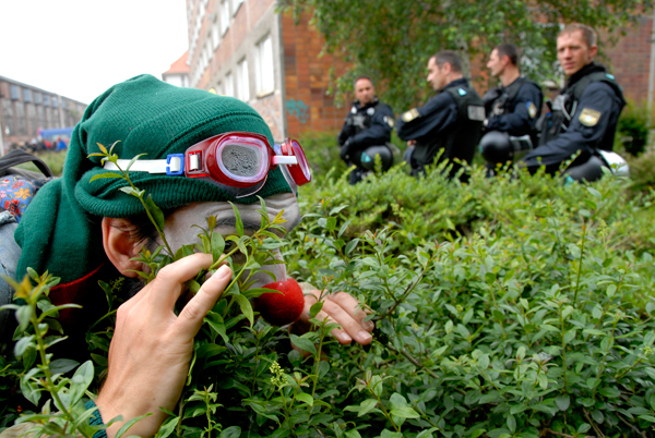 Na de grote demo op 1 juni is het vandaag weer anti-G8 mobilisatie in Rostock: een actie dag met het thema Vlucht en Migratie. Om 8.00 vertrekken we uit het kamp in Reddelich naar het lokale IND kantoor in Rostock. Anti G8 protesten Migratie actie dag Demo verslag Rostock, 4 June 8.00- 10.30 Na de grote demo op 1 juni is het vandaag weer anti-G8 mobilisatie in Rostock: een actie dag met het thema Vlucht en Migratie. Om 8.00 vertrekken we uit het kamp in Reddelich naar het lokale IND kantoor in Rostock. Vanuit dit kantoor wordt voor de regio beslist over het toewijzen van paspoorten, het uitgeven van verblijfsvergunningen en over deportatie van migranten. Het plan van de ochtend: een blokkade van het kantoor. Vanaf de ingang van het actie kamp in Reddelich, tot aan het IND kantoor staan vele groene politiebussen langs de wegen en in de bossen geparkeerd. Aangekomen bij het IND kantoor zijn de toegangspoorten al geblokkeerd door een tiental demonstranten die voor de deuren op de grond zitten. Een aantal zijn op het dak geklommen en hangen spandoeken aan de dakreling. Door de organisatie worden de demonstraten opgeroepen om het niet te laten escaleren zoals alsgelopen zaterdag. Ook worden de tientallen aanwezige agenten en ME-ers vriendelijk verzocht weg te gaan: ze zijn hier niet nodig! ME en politie zijn in grote getale aanwezig: ze staan bedreigend langs de kant van de weg en filmen de demonstranten. Boven het geheel vliegt een politie helicopter. Om de polizei duidelijk te maken waarom we daar de actie doen worden er leuzen gescandeerd: “No border no nation, stop deportation” en “We are here, we will fight, freedom of movement is everybody’s right”. Dan weer een oproep van de organisatie: Een groep demonstraten die met de S-bahn wilde komen werden tegengehouden en gefouilleerd. Uiteindelijk werden ze weer vrij gelaten. Na een half uur komt de demonstratie uit het andere actie kamp in Rostock aan onder luid applaus en gejoel van de al aanwezige demonstranten en onder begeleiding van 4 ME bussen. In totaal zijn we nu ongeveer 1000. Een aantal vertegenwoordigers van migrantengroepen doen het woord. Aansluitend wordt het grote Deutschland such den Superdeutschen (Duitsland zoekt de Superduitser) gespeeld. Onder deskundige begeleiding van de spelpresentator en z’n lieftallige asistente mogen 4 kandidaten, 9 verschillende typen (de voetbalfan, de eco activist, de flexwerker, etc) kiezen. Degene die afvallen worden met een piepschuim stok ‘uit het veld geslagen’. De politie is niet geamuseerd (of misschien is het ze verboden te lachen). Daarna begint de sambaband. Het is een af en aanrijden van politie en ME die op hun beurt weer in de maling worden genomen door de Rebel Clown Army. Ondanks de provocatie van de massale politieaanwezigheid komt het nog niet tot een confrontatie. Met de media bus gaan we door naar de volgende lokatie waar vandaag actie zal worden gevoerd: Rostock-Lichtenhagen. Hier werd door racisten in 1992 een huis in de fik gezet waar migranten woonden. Twee dagen stond het huis in brand: de buren klapte de pogrom toe en de politie stond erbij en keek ernaar. De anti-G8 karavaan trekt er naartoe om actie te voeren. Tegelijkertijd zal er actie worden gevoerd bij een lokale Lidl supermakt ism de Andalusische vakbond van plattelandsboeren. Op weg naar de actie worden de wegen gecontroleerd door rondscheurende politiebussen, ME bussen, waterkanonnen en ziekenwagens. Nog twee en een halve dag voor het einde van de G8! E-Mail: marten@ojala.nl |