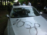 At the West Gate of the G8 summit a car carrying Russian delegates attempted to pass protesters. It was blockaded and damage was inflicted to the car.
