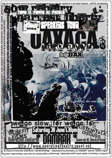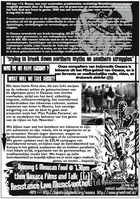 Last year we had some infonights with the Operating Theater and a live phone link with a compa from the indymedia oaxaca collective. a lot of things have happened since, here and there, and a lot has happened, moved on... or has it?...     some have labelled oaxaca as the new hope, the new argentina, the barricades and the struggle, the organising and the direct action, resistance and rebellion. but were did all go? we have the opportunity to ask and give ideas to a live activist from the social movement in oaxaca and indyoaxaca, this coming Saturday at the Damrak, amsterdam from 7:30 details bellow. ************ dutcho firsto ingleso luego, ja! ************ Dit is een benefiet en tegelijkertijd een introductie van drie nog komende workshops waarin we het sociale conflict in Oaxaca in detail willen gaan belichten. Binnenkort organiseren we dus drie infoavonden met films en sprekers, over de volgende onderwerpen:>> 1 Inheemse sociale bewegingen, roots, populaire organisatie, kolonialisme, verzet, cultuur, gemeenschap en vrije media vanuit de gemeenschap. repressie.> 2 De opstand in de stad Oaxaca - APPO, doodseskaders, leraren, koloniën, buurten & barricades. partijen, organisaties, gemeenschappen en anarchisten. communiceren via massamedia en onafhankelijke media, handel. updates.> 3 Toekomst & solidariteit.... Megaprojecten, emigratie, fascisme en Plan Puebla Panama. Vrijhandel en neocoloniale multinationale invasie. organisatie en samenwerking vanuit de grassroots, gedeelde strijd. 500 jaar +14. Boven, een zeer omstreden presidentiele verkiezing. Beneden, een campagne mogelijk gemaakt door de Zapatistas, om de grassroots en antikapitalistische beweging in het hele land een focus te geven.2006 was een tumultueus jaar voor mexico, en het einde is nog niet in zicht. Toenemende protesten en de jaarlijkse staking van leraren in oaxaca, in zuid-oost mexico, groeiden uit tot de grootste volksrebellie in meer dan een decenniun.Honderden illegale opsluitingen, verdwijningen en verwondingen, en mintens achttien gedocumenteerde doden volgden. In Oaxaca veranderde een brede beweging, die als doel had het aftreden van een onpopulaire en corrupte gouveneur, in een volksopstand voor directe democratie. Honderden bewoners van de 800. 000 mensen tellende stad en uit de omgeving, belegden meer dan 1000 barricades, protestkampen, bezettingen van overmeidsgebouwen, als ook de letterijke overname van mainstream media.Later stuurde de federale regeringe van Mexico duizenden manschappen ME om de volksopstand te breke, en om het regime en de status quo te redden. Een stem in al deze gebeurtenissen is een levendige onafhankelijke media-beweging. Onze compañero van Indymedia Oaxaca is inheems uit het Mixe-gebied van Oaxaca, en is een fervente en onafhankelijke radio, video, en drukwerk aktivist. - Indyoaxaca. We laten korte films zien, die licht zullen werpen op de redenen achter de gebeurtenissen van de afgelopen jaren in Oaxaca, die te maken hebben met slechte overheden, strijd om het land, uitbuiting, migratie, milieuvernietiging, het voortdurend onderdrukken van inheemse culturen, andere manieren van leven in Mexico, hun eeuwige weigering om aan de kant te gaan voor projecten zoals het 'Plan Puebla Panama', en om te verdwijnen ten behoeve van het gewin van de rijken en het 'Noorden'. We kijken naar wat dit betekent, om inheems te zijn, om autonoom te zijn, rebels, om te organiseren en zich te verzetten. Verzet tegen dammen, wegen en agribusiness, biodiesel plantages of de commerciele TV. We geven updates over de EZLN campagne van voortdurend verzet, en kijken naar de betrokkenheid van Europa en Groot Brittannië in het gebied, analyseren dat en trekken parallelen met lokale strijd, organisatie van de gemeenschap, en onafhankelijke media hier. We hopen op jullie betrokkenheid en hopelijk kijken we in onze eigen realiteit, akties, en verder... hopelijk. ***************************************************** ***************************************************** ----glish--- This is a benefit infonight as an introduction to 3 upcoming workshops explaining in detail the struggles in oaxaca. Soon we will organise infonights with films and talk on>> 1- Indigenous struggles. roots. popular organisation, colonialsim, resistance, culture, community and community controlled free media. repression.> 2 - The Uprising in Oaxaca city - APPO, death squads, teachers, colonies, neighbourhoods & barricades. parties, organisations, communities and anarchists. talking over corporate media & independent media, trade. updates.> 3 - Future & solidarity... Megaprojects, emigration, fascism and Plan puebla panama. Freetrade and new colonial corporate invasion, organisation and cooperation on the grassroots. common struggles. 500 years + 14. Above, a highly-contested presidential election. Bellow, a campaign facilitated by the Zapatistas to focus the grass roots anti-capitalist Left all over the country. 2006 was a tumultuous year in Mexico... there is no end in sight. Increasing movement protests and the annual teachers strike in the south-eastern Mexican city of Oaxaca became the largest popular rebellion in over a decade. Then hundreds of illegal detentions, disappearances and injuries, and at least eighteen documented deaths followed. In Oaxaca, a broad-based movement to unseat an unpopular and corrupt governor turned into a grassroots uprising for direct democracy. For months, hundreds of residents in the half million people City and surrounding area took part in and maintained more than 1,000 street barricades, protest camps, occupations of government buildings as well as the literal takeover of mainstream media outlets. Mexico's federal government later sent in thousands of militarized police to crack down on the popular uprising and prop up the regime of the status quo. Talking part in all of these events is a lively independent media movement . . . our IndyOaxaca compañero is indigenous to the mixe territory of oaxaca and 