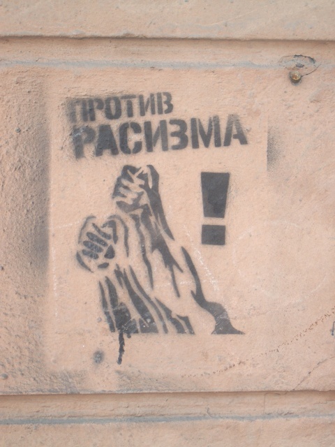 "PROTIV RASIZMA" Zie hier een spuitmal afkomstig uit Sint Petersburg dat de russische ambassademedewerkers in ieder geval zullen begrijpen. Print uit, snij uit of plak op! | | foto's picketline russische ambassade 25/7 | frank - 25.07.2007 15:22