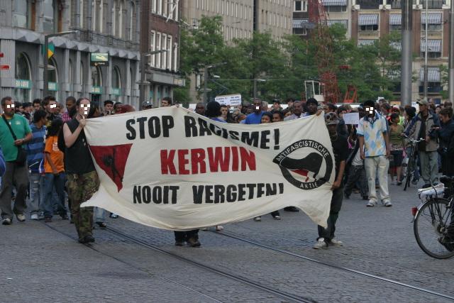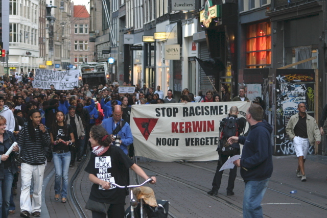Op maandag 20 augustus wordt Kerwin herdacht. In 1983 toen hij 15 jaar was, werd hij vlakbij de Dam door een blanke leeftijdsgenoot vermoord om zijn zwarte huidskleur. Gedicht voor Kerwin - Maurice Di -  flyer kerwin herdenking 2007 KERWIN HERDENKING 2007 Op maandag 20 augustus wordt Kerwin herdacht. In 1983 toen hij 15 jaar was, werd hij vlakbij de Dam door een blanke leeftijdsgenoot vermoord om zijn zwarte huidskleur. Vier-en-twintig jaar na de racistische moord op Kerwin worden nog steeds mensen om hun huidskleur, hun geloof, hun sexuele geaardheid of hun afkomst gediscrimineert, bedreigd, mishandeld en soms vermoord. Het blijkt dat elke jaar een andere groep als zondebok gebruikt wordt. Dit jaar, bijvoorbeeld is in Nederland een grote toename van homophobie geweest. Op de Dam vind elk jaar deze herdenking plaats. Sinds 2003 probeert Stichting Vrienden van Kerwin jongeren actief te betrekken bij deze dag. Wij vinden het belangrijk dat jongeren van nu begrijpen waarom de moord op Kerwin in 1983 zo’n enorme klap was voor de Nederlandse bevolking die toen nog over ‘tolerantie’ droomde. Dit jaar is er weer een jeugdprogramma en aansluitend een tocht naar het Vondelpark, niet alleen als een demonstratie tégen racisme, maar vooral ook een demonstratie van de positieve kracht van jongeren. Het thema van dit jaar is “Identiteit” Vanaf 14.00 uur zijn er veel activiteiten voor jongeren, workshops voor jong en oud over kunst, gespoken word, muziek, theater, een cursus gezond ruziemaken & oplossen in school en buurt, en posters maken. Op de infomarkt komen o.a. Art.1, Amnesty International, Forum, UNITED, AFA, Matinyana Fonds, COC Nederland, Mediation Team, CIA (Jellinek), Borderline Books, Stichting Minority’s, Samen Tegen Racisme en andere organisaties die proberen de situatie van vluchtelingen, migranten, en andere minder zichtbare ‘minderheden’ te verbeteren. Zo komen er bij de stands veel discussie groepen en interactive enquettes. Dit jaar hebben wij ook groepen dove kinderen en jongeren uitgenodigd om deel te nemen in de verschillende activiteiten. Om 18.00 uur begint het manifestatie met sprekers, dichters en muziek. Tolk gebarentaal aanwezig. Rond 19.00 uur gaat de demonstratie van de Dam naar het Vondelpark, waar vanaf 19.45 uur bij het standbeeld Mama Baranka een kranslegging is, met muziek en teksten van enkele dichters. E-Mail: info@kerwin.nl Website: http://www.kerwin.nl |