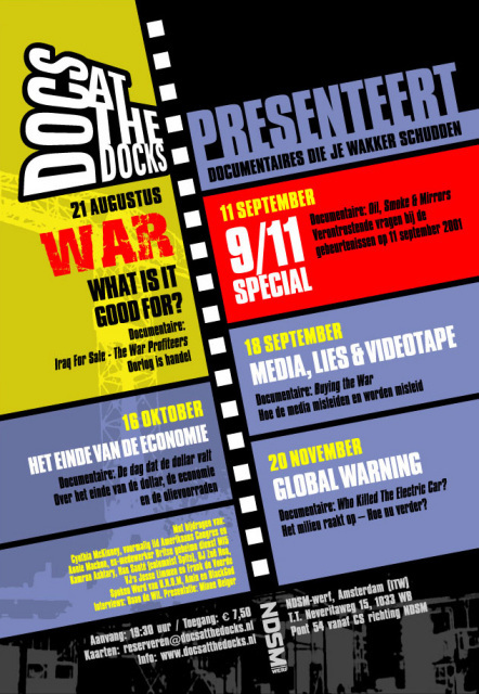 Wat hebben een ex-spion van de MI5, een oud-congreslid uit de VS, een stel onderzoeksjournalisten van Nederlandse bodem, een columnist van Spits! en een terreurdeskundige met elkaar gemeen?   Antwoord: zij zijn allen op 11 september aanwezig bij Docs at the Docks, een kritische documentaireserie die wordt gehouden op de NDSM werf in Amsterdam Noord. De gasten van deze speciale avond zijn door de Docs uitgenodigd om o.a. diep in te gaan op de verontrustende vragen bij 9/11. Verder laten we je veel beelden zien die – op z’n minst – aantonen dat de officiële versie van het verhaal van geen kanten klopt. Ook vertonen we de documentaire ‘Oil, Smoke & Mirrors’, die op zeer indringende wijze laat zien wat volgens ingewijden de directe aanleiding was voor 11 september en vooral: wie er achter zitten. Check it out! Kaarten reserveer je via: reserveren@docsatthedocks.nl datum: dinsdag 9 september 2007 aanvang: 20u30 lokatie: ITW, NDSM, tt Neveritaweg 15 entree: 7,50 euro De vorige editie van Docs at the Docks was volledig uitverkocht. Wees er dus op tijd bij. E-Mail: info@docsatthedocks.nl Website: http://www.docsatthedocks.nl |