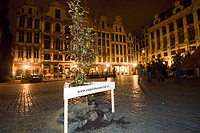Europese Commissie, stop de handel in illegaal gekapt hout!' Activisten planten illegaal bomen in Brussel Amsterdam, Brussel, 5 december- In de nacht van 28 november hebben activisten van Milieudefensie en Friends of the Earth Vlaanderen & Brussel illegaal bomen geplant in Brussel.  Het illegaal planten van bomen gebeurde onder meer op de Grote Markt, bij het Atomium en bij de Europese Commissie. De actie illustreert de absurde situatie dat het planten van bomen strafbaar is, terwijl de Europese handel in illegaal gekapt hout ongestraft blijft. Beide organisaties roepen de Europese Commissie op om milieuwetgeving in te stellen. ´s Morgens boden de organisaties een boom aan aan Eurocommissaris Dimas (Milieu). Beide organisaties roepen de Europese Commissie op om milieuwetgeving te steunen die vereist dat alle hout en houtproducten op de Europese markt alleen uit legale bronnen en verantwoord beheerde bossen komt. Eurocommissaris Dimas deelt de zorgen van de milieuorganisaties. Hij noemde vanochtend klimaatverandering een 'belangrijke reden om iets aan het probleem te doen'. Hij stelt dat 'bindende regelgeving' daarvoor noodzakelijk is. Een datum waarop die regelgeving er zou moeten zijn, kon Dimas niet noemen. 'We zijn blij dat Dimas onze zorgen deelt. Maar het tempo waarmee de noodzakelijke wetgeving tot stand komt, is veel te langzaam,' aldus Anne van Schaik, campagneleider van Milieudefensie. Om de noodzakelijke wetgeving te bespoedigen zal de boomplantactie in andere landen worden vervolgd. In Nederland is eerder wel aangifte gedaan van illegale kap en gerelateerde handel, maar die kon het openbaar ministerie niet in behandeling nemen. Voortrazende ontbossing leidt tot verlies van biodiversiteit, sociale conflicten, diepe armoede en wakkert klimaatverandering aan. Twintig procent van de CO2-uitstoot komt door ontbossing. Overexploitatie en illegale kap zijn belangrijke oorzaken van ontbossing. Illegale kap is wijdverspreid in veel houtproducerende landen, vooral in landen waar overheden zwak zijn en corruptie welig tiert. Het aandeel illegale kap in Indonesië ligt tussen de 70 en 90 procent. En in regio's zoals de Amazone, het Congo Bekken en Rusland is ongeveer de helft van alle houtkap illegaal. De Europese Unie lanceerde het 'Forest Law Enforcement Governance and Trade Action Plan' (FLEGT) in 2003, een actieplan om illegale kap en handel tegen te gaan. Het FLEGT-proces is in een cruciale fase gekomen, waarin beslissingen over om wetgeving moeten worden genomen. Meer informatie: www.stopdebossenroof.nl E-Mail: margot.verhagen@milieudefensie Website: http://www.stopdebossenroof.nl |