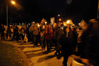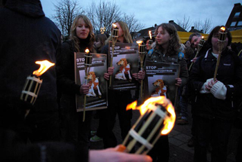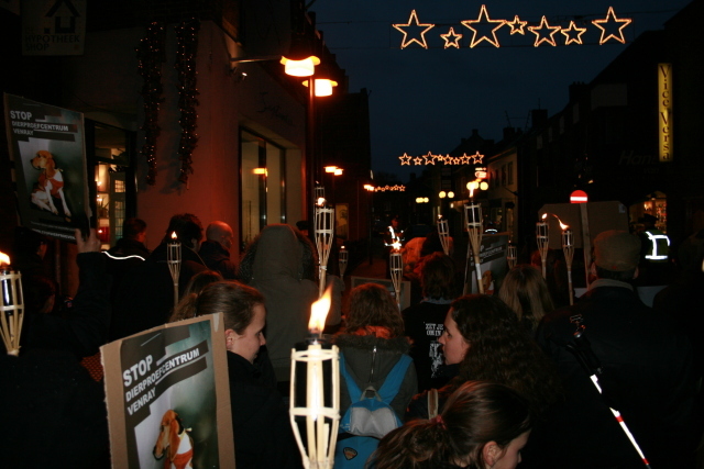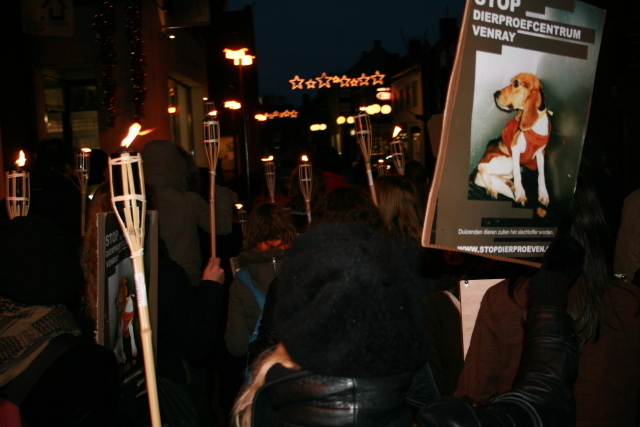 LUID PROTEST DOOR DE STRATEN VAN VENRAY TEGEN SCIENCELINK...  speech voor de fakkeloptocht  de honderd protestborden   Het spandoek   'Dieren hebben rechten' van de 9 jarige Daniël     Het einde van fakkeloptocht Op het Henseniusplein/Schouwburgplein kwamen om 14.00 dierenvrienden uit heel het land en ver daarbuiten samen om te genieten van heerlijke cupcakes, soep, taartjes en tofubroodjes. De informatiestands werden goed bezocht en raamposters werden meegenomen. Marjam, inwoonster van Venray en eigenaresse van beagle Joep, gaf een motiverende speech. 'Ik zal mij inzetten voor de dieren tot mijn laatste adem' was haar belofte aan de vele toehoorders. Om 16.15, nadat alle fakkels waren uitgedeeld begon de stoet te lopen. 'Sciencelink - Schande voor Venray!' galmde door de straten. 300 woedende dierenvrienden, met protestborden, spandoeken en megafoons liepen stapvoets door hartje Venray. Ondanks de regen zat de spirit er goed in. Mede ook door de sympathie die we ontvingen van voorbijgangers die hun duim opstaken. Uiteindelijk wil niemand een dierproefcentrum in Venray. De route liep langs de Zuidsingel en ging het St. Antoniusveld in. Hier woont de heer Heldens, wethouder bij de gemeente Venray. Hij promoot Sciencelink en probeert huurders en kopers te vinden - overigens zonder succes. De hele wijk stond op zijn kop. Buurtbewoners stonden buiten en hingen uit de ramen. Aangekomen bij het huis van Heldens hielden we een korte toespraak over Sciencelink en het gebrek aan empathie van Heldens voor de dieren. Daniël, 9 jaar, legde een krans voor de deur als symbool voor al die dieren die gepijnigd gaan worden in Venray. Nog altijd schreeuwden de mensen de longen uit hun lijf; "stop dierproeven - stop Sciencelink!". Aangekomen bij de 'zichtlocatie' aan de A73 werden we getracteerd op koffie, thee en warme soep. Danny Flies hield een geweldige toespraak en wees iedereen op de feiten. We kunnen Sciencelink stoppen. Het is aan ons om het verschil te maken voor alle dieren die sterven in laboratoria. Er is geen plek voor een nieuw dierproefcentrum. Niet in Venray, niet in Nederland, niet in België. Het is aan ons allen om een einde te maken aan het lijden van de dieren. Bij deze willen we iedereen bedanken voor de geweldige inzet! |