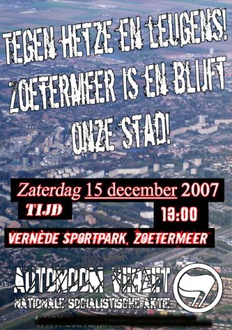 Zonder enige belangstelling vanuit media en antifa Nederland hebben een paar Jeugdstormers zaterdag in Zoetermeer gemarcheerd. Op de site van Stormfront is te lezen dat sprekers waren Alwin Walther en de Hitler-adept Stefan Wijkamp. Kortom, hieruit blijkt maar weer eens dat wanneer antifa's geen tegendemo houden er geen tot amper publiciteit is voor extreemrechts- iets om over te na te denken voor de toekomst. | | Aandacht | Autonome Antifa Anywhere - 16.12.2007 17:20