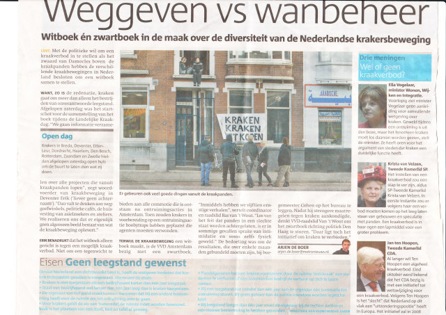Gister stond er een stukje in de Metro (rotterdam editie) titel: Weggeven vs wanbeheer subtitel: Witboek en zwartboek in de maak over de diversiteit van de nederlandse krakersbeweging.