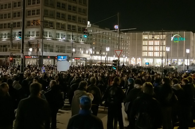 Dus wat deden ze? Ze belden de politie en vroegen hulp bij het organiseren van een mars naar de Alexanderplatz. En twee uur laten stonden er tussen de 500 en 700 geeks klaar om nee te zeggen tegen Stasi 2.0, zoals ze het noemen. De politie regelde het verkeer und los ging es.