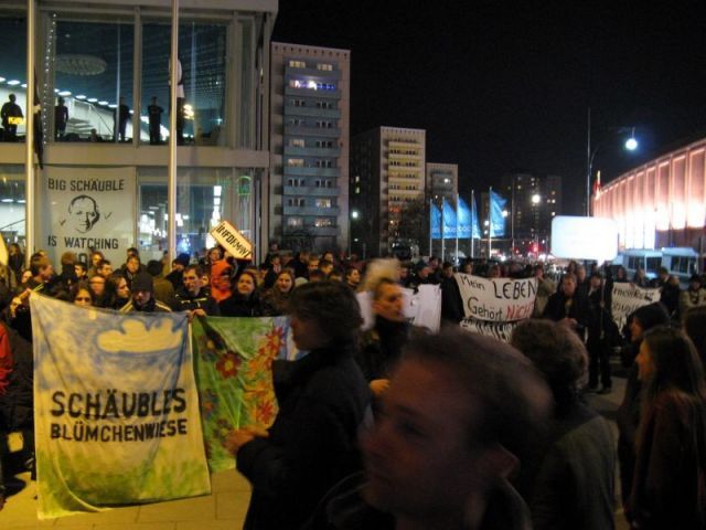 Op het Chaos Computer Camp was het opeens paniek in de hut. De hackers besloten spontaan een demonstratie te houden tegen de bewaarplicht verkeersgegevens. Ze gingen met 500 tot 700 mensen de straat op om naar de Alexanderplatz in Berlijn te gaan. De politie moest met spoed aanrukken om de kruisingen af te sluiten en het verkeer in goede banen te leiden. Het protest verliep vreedzaam en zonder incidenten. Er wel gezongen en gescandeerd en de term “Stasi 2.0″ viel meer dan eens. Zie ook het foto verslag in de rest van dit artikel.