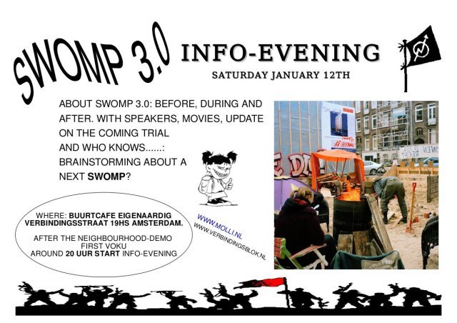 Inmiddels is het al weer 1 1/2 maand geleden dat Swomp 3.0 ontruimd is. Gelukkig is de laatste arrestant van Swomp toch eerder vrijgelaten. Maar dat betekent niet dat het boek Swomp 3.0 gesloten kan worden. In tegendeel, een volgend hoofdstuk dient zich aan, dus daarom een infoavond over Swomp 3.0.  Flyer Deze avond willen we gebruiken om terug te kijken op Swomp 3.0, het hoe en waarom van onze actie. Wat we hiermee bereikt hebben. Daarbij willen we, eigenlijk alleen maar positieve, filmpjes en dergelijke tonen. Daarnaast komt de juridische situatie aan bod met de aankomende rechtszaak van 22 januari voor de vier Swomp-arrestanten. En wie weet, komen er plannen naar voren van Swomp 4.0. Want we zijn nog niet klaar, we beginnen net. Zoals een ex-swomper verwoorde: "Als de staat door middel van dit soort praktijken kritische mensen wil afschrikken om niet langer hun bek open te trekken, om niet langer actie te voeren tegen allerlei misstanden, moeten ze toch van andere huize komen. We komen niet gebroken naar buiten, vooral niet na die paar weken, eerder strijdvaardiger en vol energie. Genoeg bajessen om te slopen, genoeg grenzen die open moeten, genoeg te doen om de vernietiging van milieu, mens en andere diersoorten te stoppen, genoeg staten die vernietigd moeten worden en vervangen door anarchistisch zelfbestuur en genoeg ruimtes die leegstaan en weer gebruikt moeten worden! Dus ik wil mijn caravan terug! Ex-swomper " De infoavond vindt plaats op zaterdag 12 januari in Buurtcafe de Eigenaardig, verbindingstraat 19 hs te Amsterdam. Na de buurtdemo zal er eerst voku zijn (rond 19 uur) en daarna rond een uur of 20 zal de info-avond beginnen. Meer info over swomp: