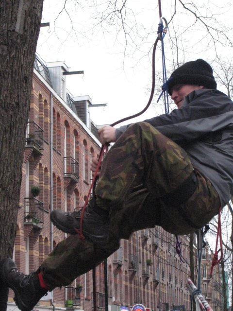 Het Dagelijks Bestuur van stadsdeel Zeeburg heeft opdracht gegeven maandagochtend te beginnen met het kappen van 34 bomen in de Amsterdamse Javastraat. Vier tegenstanders hebben zich tussen de takken verschanst om de kap van even zovele bomen te dwarsbomen.  Vanaf de straat vallen ze nauwelijks op. Op circa tien meter hoogte zitten de eco-activisten ietwat ongemakkelijk op een dikke tak, ter hoogte van de stam. In alle vroegte zijn ze met touwen naar boven geklommen, om vervolgens de hele dag hun stek bezet te houden. Ze houden zichzelf bezig met lectuur en gsm. Warme kleding dient hen te beschermen tegen de kou. Slechts voor plaspauzes wordt de benarde positie voor even verlaten, hetgeen tevens de gelegenheid biedt de spieren te ontspannen. Voorbijgangers hebben nauwelijks oog voor wat zich afspeelt boven hun hoofd, voor zover ze het al in de gaten hebben. Terwijl het toch een unicum is dat in Amsterdam de bomen bezet worden gehouden door mensen. De laatste keer dat hier sprake van was, betrof het bos bij Ruigoord, alweer tien jaar geleden. Maar actievoerende boomklimmers in de binnenstad, nee, dat is apart. Slechts een enkele voorbijganger steekt de duim omhoog, uit sympathie voor de inzet van deze bevlogen jonge mensen. Een buurtbewoner heeft rouwlinten gestrikt rond de stam van de bedreigde iepen. De kap van de iepen loopt door deze actie slechts vertraging en publiciteit op, wat op zicht mooi meegenomen is. Maar uiteindelijk belanden ook deze zestig jaar ouden bomen in mootjes op de vrachtwagen, die maandagmiddag rond vier uur de Javastraat verliet. Bij het invallen van de schemering waren er zo'n 16 grote iepen neergehaald, de rest komt de komende dagen aan de beurt. De actievoerders bevinden zich in de vier grootste iepen aan het einde van de Javastraat, ter hoogte van het spoor. Aanvankelijk was het stadsdeel van plan om op 23 januari te gaan kappen. Het stadsdeelbestuur besloot het werk uit te stellen tot de uitspraak van de Raad van State (RvS). Tegenstanders verzochten de RvS het stadsdeel niet toe te staan de bomen te kappen. Net als de Rechtbank van Amsterdam een week eerder, heeft de RvS in zijn uitspraak van vrijdag 25 januari het stadsdeel in het gelijk gesteld. Het verzoek van de tegenstanders om een voorlopige voorziening is afgewezen en het beroep is ongegrond verklaard. De Indische buurt moet broodnodig worden "opgepept", zo vinden de beleidsmakers van stadsdeel Zeeburg. Het huidige "smoezelige karakter" van de Javastraat, dé winkelstraat van de buurt, moet veranderen in een "mediterrane winkelpromenade" waar het "leuk vertoeven" is. De herprofileringsplannen dateren al van halverwege de jaren '90, maar nu de Europese Commissie een flinke bijdrage levert (2/3 van de financiering) wordt er haast mee gemaakt. Rond half vijf lieten de vier eco-activisten zich aan het touw naar beneden vieren, opgeacht door actievoerders die hen de hele dag nauwlettend in de gaten houden en voorzien van drank en voedsel. Dinsdagochtend vroeg klimmen ze weer naar boven, dit alles voor het goede doel. Naar alle waarschijnlijkheid zal het er dan om gaan spannen, aangezien de kapwerkzaamheden in rap tempo naderbij komen. Morele steun kunnen ze hierbij te allen tijde gebruiken. Ga eens bij ze langs in de Indische buurt. bron: http://www.ravagedigitaal.org/2008nieuws/januari/36/nws.php |