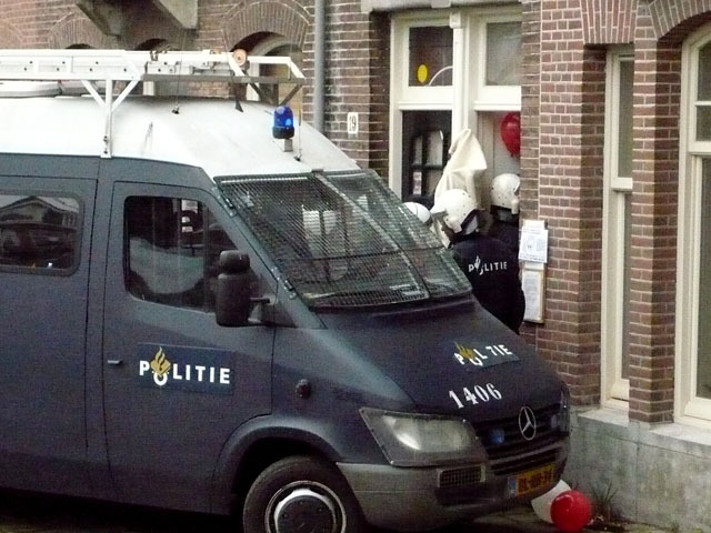 Some pictures of the eviction of Biko 19 by the police despite no subpoena of the registered inhabitants as required by Dutch law.  Bratra tackle ballons The neighbors stood round and watched, and supported the squatters, as the police showed pure force of numbers. The Bratra bravely fought of balloons to gain entry to the building. |