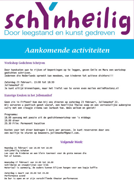 Hier het eerste programma van Schijnheilig aan het Jollemanhof. Schijnheilig gaat vanaf nu beginnen met een maandelijks VoKu. De eerste zal aanstaande zaterdag starten. Iedereen is van harte welkom, maar probeer a.u.b. wel te reserveren via emailadres:  bewoners.jollemanhof@gmail.com.