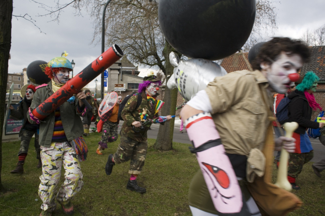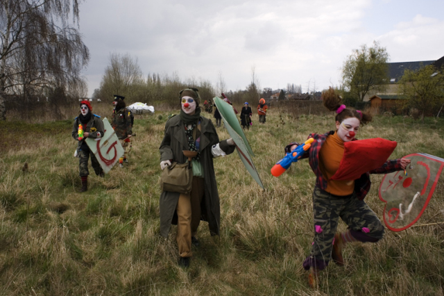 Circa 70 rebel clowns uit vooral Frankrijk, Nederland en Duitsland verzamelden zich rond 12.30 uur bij de Avenue Artemis, zuidwestelijk van het NATO-terrein. Vooral de Franse clowns waren goed vertegenwoordigd: Parijs (B.A.C.) en Lille (Chti Clown: CAC 40). Verder ook wat Duitse en Oostenrijkse clowns. Uit Amsterdam deed Rebelact (the Amsterdam Clown Army) mee. Clowns uit Keulen en Utrecht en andere plaatsen (CloLoNeL)benaderden het gebied vanuit enkele andere vertrekpunten. Onderweg met auto's werden de eerste rebel clowns al gearresteerd. De Franse clowns hadden zich goed voorbereid op de strijd met de NATO en hun 'bonezookas' meegenomen (bazookas die grote botten kunnen afschieten met clowneske precisie). Rebelact had twee reuzecatapults meegenomen om 'n grote hoeveelheid teddyberen en andere knuffels op de ordetroepen af te voeren. Vanzelfsprekend op 'n heel vreedzame manier (zoals de bedoeling was van de actie). De gezamenlijke operatie van met Franse en Nederlandse gaggles strandde echter helaas al vrij snel in 'n modderig stukje natuur in de directe omgeving van het NATO-hoofdkwartier. Na observaties van 'n helikopter werd het internationale samenwerkingsverband van rebel clowns aan alle kanten ingesloten. Een overdaad aan agenten, en ook wat stillen zorgden ervoor dat vrijwel iedereen rond 13.30 uur gearresteerd werd, geboeid en vervolgens in bussen naar het Paleis van Justitie werd afgevoerd. Daar stond inmiddels een file van bussen met arrestanten. In 'n tergend langzaam tempo kwam onze bus dichterbij de politie ingang. Eén arrestant slaagde erin op 'n goed moment te ontsnappen. Vervolgens ging het ritueel verder in 'n binnenplaats waar de clowns de tijd gebruikten voor wat spelletjes. Daarna in groepjes de cellen in. Sommige héél kleine cellen werden door 3 mensen bevolkt (waar maar 2 zitplaatsen waren). In iets grotere cellen werden 11 mensen gepropt. Ergens na 14.00 uur zat iedereeen (afkomstig uit die bussen) vast in 'n uit meerdere etages omvattend cellencomplex. Zo'n 6 à 7 uur zonder aanklacht, zonder eten, zonder drinken en zonder reactie op mensen die dringend naar het toilet moesten. In de 'middeleeuwse' kerkers ontbrak 'n knop om te bellen voor hulp. Dit leverde bij tenminste één arrestanten die ernstig mishandeld was grote risicico's op (behandeling in 'n ziekenhuis was nodig). Uiteindelijk is daar na 'n uur iets aan gedaan. Pas rond 19.00 / 20.00 kreeg 'n deel van de arrestanten de gelegenheid naar het toilet te gaan. Sommige arrestanten werden gedwongen de ruimte tussen de cellen te gaan schoonmaken. Tegen 20.30 / 21.00 uur werden de laatste cellen leeggemaakt. Vervolgens werd van iedereen foto's gemaakt en I.D. gecheckt en andere persoonlijke gegevens opgenomen. Persoonlijke spullen die door de behandeling van de smeris kwijtgeraakt waren, werden ondanks aandrang niet genoteerd. De reactie was zwaar geirriteerd: er moest nu 'rap' ondertekend worden voor vrijlating ("anders wacht opnieuw de cel"). Na de vrijlating zorgde een pendelbus van Bombspotting ervoor dat de ex-gearresteerden naar 'n verzamelplek/café werden gebracht waar ze even op adem konden komen. Sommige clowns bleven in Brussel voor de conferentie, de Franse clowns zochten hun auto's op en ook de Nederlandse bussen gingen ook huiswaarts. Die naar Amsterdam om 22.30 uur. Samengevat: géén aanklacht, urenlange vastgehouden, geen mogelijkheid om contact met 'n advocaat kontakt op te nemen, geen eten, geen drinken, en 'n uur of 6 à 7 geen kans om naar de toilet te gaan. Repressie en intimidatie in de 'beste' Belgische vorm in 'n ongelooflijk achterlijk cellencomplex. Smeris die vrijwel nergens op reageert wat de grootste risico's met zich meebrengt voor gedetineerden. Agressieve agenten die 'n gearresteerde fotograaf dwongen zijn opnames te deleten. Gelukkig was de fotograaf 'n stuk slimmer dan de Belgische agenten en zullen er binnenkort prima foto's te zien zijn: zowel van rebel clowns buiten, de arrestaties als unieke opnames vanuit de kerkers. De urenlange volkomen onrechtmatige vrijheidsberoving is in sommige cellen goed gebruikt voor het opfrissen van internationale contacten, uitwisseling van inspirerende ideeën en nieuwe spannende plannen van de rebel clowns!