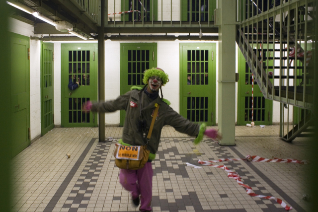 One of the participants of 'NATO Game Over' (probably from Luik/Liège)made a film. First pictures inside one of the police bus transports. After: the cell complex in the 'Palace of Justice'. Especially moments some rebel clowns entering the complex. One of the last images: an Amsterdam clown falls down the stairs before throwing in one of the many cells.