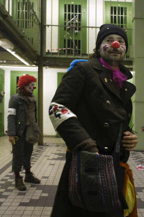 Ik krijg weer een sms uit de clown groep: "Wil je op Indymedia zetten dat arrestanten gedwongen worden de gevangenis schoon te maken. En al sinds zes uur geen wc of water of eten" (kregen)...