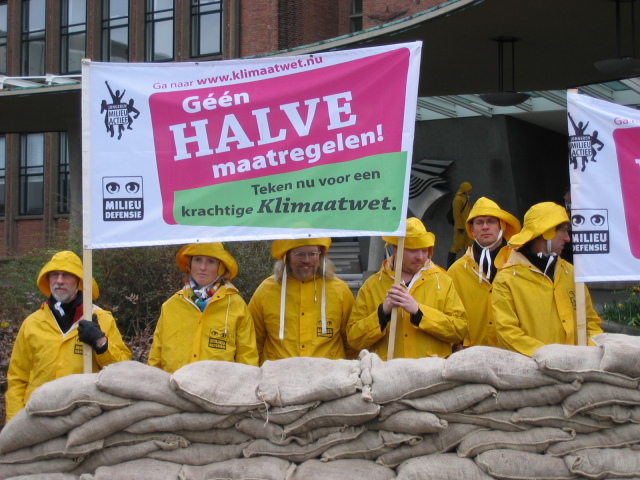 Amsterdam, 26 maart 2008 - Actievoerders van Milieudefensie legden vanochtend een dijk van zandzakken voor de deur van het Ministerie van Verkeer. Daarmee protesteren ze tegen het 'klimaatconvevant verkeer' dat het kabinet en de brancheorganisaties uit de verkeer- en vervoerssector vanochtend zouden ondertekenen. “Vrijblijvende afspraken zijn volstrekt ontoereikend om de onstuimige groei van de CO₂-uitstoot door verkeer en vervoer om te zetten in de broodnodige daling”, aldus Willem Verhaak van Milieudefensie. “Alleen met forse maatregelen kan het tij worden gekeerd. Milieudefensie pleit daarom voor de invoering van een klimaatwet, waarin de beoogde CO₂-reducties juridisch bindend worden vastgelegd. Voor vrijblijvendheid is het klimaatprobleem veel te urgent.” Tegelijkertijd leggen drie Balkenendes een mini-dijkje met mini-zandzakjes aan. Milieudefensie verbeeldt zo de halve maatregelen waarmee het kabinet Balkenende klimaatverandering te lijf gaat.  Balkenendes nemen halve maatregelen, actievoerders bouwen dijk    Het kabinet bouwt haar beleid tegen klimaatverandering voor een groot deel op convenanten met het bedrijfsleven. Eerder al werd een overkoepelend 'duurzaamheidsconvenant' afgesloten, waarin duidelijk werd dat het bedrijfsleven zich niet gebonden voelt aan de kabinetsdoelstelling van 30 procent reductie in 2020, maar het houdt bij 20 procent. Willem Verhaak: “Ervaringen uit eerdere convenanten, zoals het Benchmarkconvenant Energiebesparing, zijn niet hoopgevend. Zo is het energiebesparingstempo gedaald in plaats van gestegen. Convenanten zijn hoogstens geschikt voor informatieoverdracht vanuit het rijk via de brancheorganisaties naar de aangesloten bedrijven. Maar niet om grote emissiereducties te realiseren. Daarvoor is een klimaatwet nodig.” Eind februari begon Milieudefensie daarom samen met Stichting Natuur en Milieu, Jongeren Milieu Actief en een brede coalitie van maatschappelijke organisaties een campagne voor de invoering van een klimaatwet. Op de website http://www.klimaatwet.nu kunnen burgers de oproep steunen. De campagne maakt deel uit van de HIER klimaatcampagne. Vandaag staan de actievoerders bij het Ministerie van Verkeer & Waterstaat, omdat in het verkeer de grootste toename te zien is van de uitstoot van broeikasgassen: maar liefst 36 procent in de afgelopen 15 jaar. Daarmee is de verkeerssector verantwoordelijk voor 22 procent van de broeikasgas-uitstoot in Nederland. Onlangs kwam de Raad voor Verkeer en Waterstaat met een alarmerend rapport waaruit blijkt dat zonder drastische maatregelen de transportsector in 2050 de gehele Europese ruimte voor CO₂-emissie in beslag zal nemen. “Minister Eurlings moet het roer drastisch omgooien. Dat kan door bijvoorbeeld de miljarden die op de plank liggen voor wegenuitbreiding te investeren in beter openbaar vervoer en door rijden in zuinige en schone auto's nog veel aantrekkelijker te maken. Ook zou de CO₂-uitstoot middels heffingen duurder moeten worden, iets dat eerder ook al werd bepleit door de Raad voor Verkeer en Waterstaat. Ook de groei van het vliegverkeer kan aan banden worden gelegd, door bijvoorbeeld een stop op de uitbreiding van de luchthavencapaciteit”, aldus Willem Verhaak. |
