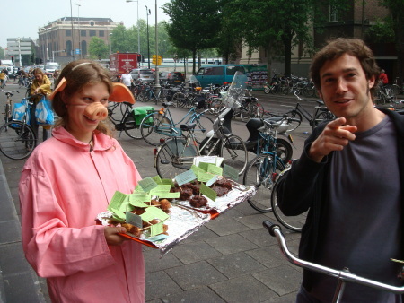 Pigs say: If you care about climate change, eat less meat, milk and eggs On Tuesday June 3rd, a group of pigs made a small action for a more vegan Amsterdam. They handed out vegan snacks to encourage people not to buy that ham for dinner. It may look like the pigs acted out of self-interest, but today their message was that meat production is a major cause of climate change. While the UN is conferring in Rome on World Food Security and Climate change, the pigs put a focus on that average Europeans have a diet of disaster. Raising animals for food generates more greenhouse gases than all the cars and trucks in the world combined.     Quite some people in front of the Albert Heijn on Jodenbreestraat were happy to taste the organic, vegan falafel and chocolate cake and many said they are vegetarians already. People were surprised to hear that producing one kilo of cheese cause as much greenhouse gas emissions as driving a car for 60 km. A Brazilian woman had witnessed the expanding soy fields used for feeding animal industry. “Consumers can make a huge improvement by avoiding animal products and imports, and by supporting local, organic farmers instead. But humans need to organise themselves fast against the dominant culture if they want to save themselves from climate chaos” the piggies stated after all the food had been handed out. Tonight, Wednesday June 4 from 19 there will be a film night in Plantage Doklaan 12, with organic vegan food and ideas on how to combat climate change. (See programme on the website) Website: http://www.howtocookaplanet.net |