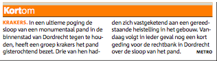 Door adequaat handelen van enkele bezorgde Dordtse inwoners is voorkomen dat Arie van Pelt zijn illegale sloop van Vrieseweg 80 voortzet. De bezetting blijkt Nodig. Van Pelt houdt zich blijkbaar alleen aan de wet als het hem uitkomt. ILLEGALE SLOOP VAN VAN PELT GESTOPT. Door adequaat handelen van enkele bezorgde Dordtse inwoners is voorkomen dat Arie van Pelt zijn illegale sloop van Vrieseweg 80 voortzet. De bezetting blijkt Nodig. Van Pelt houdt zich blijkbaar alleen aan de wet als het hem uitkomt. De Milieudienst Zuid-Holland Zuid heeft geconstateerd dat verschillende noodzakelijke aanvullende vergunningen ontbreken. Er is een dwangsombeschikking van 30.000 euro uitgegaan. Van Pelt sloopt echter gewoon door en wethouder Kamsteeg is niet beschikbaar voor commentaar. Aanstaande donderdag buigt de rechter zich over deze onbegrijpelijke gang van zaken. Het gaat om een belangrijk gebouw. De Welstands- en Monumentencommissie roemt de relatieve gaafheid van exterieur en de ensemble waarde met het buurpand. De Raad voor Cultuur noemt het pand beeldbepalend en architectonisch belangwekkend. De reden dat het pand toch gesloopt mag worden is onverklaarbaar en duidt op onbekwaam bestuur en lijkt zelfs op vriendjespolitiek. Met deze actie doen wij wat de overheid nalaat. Namelijk iemand stoppen die willens en wetens illegal een uitzonderlijk pand tegen de vlakte werkt. Wij zijn nog steeds van mening dat De Reus overeind moet blijven en gerestaureerd moet worden. Opdat iedere Dordtenaar die het centrum in rijdt kan genieten van dit schitterende ensemble. Daarnaast roepen wij burgers, bedrijven en natuurlijk overheden in om bekwaam te handelen en niet je eigen stad uit te verkopen. De waarde die wij aan historische en beeldbepalende objecten toewijzen verdient een prominente plaats in de hedendaagse maatschappij, waarin identiteit maar al te vaak verloren gaat. RED DE REUS |