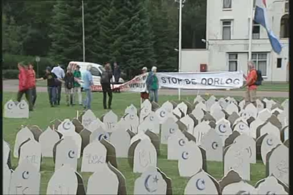 Ontwapen! plaatst 300 grafzerken voor burgerslachtoffers Afghanistan bij stafgebouw Luchtmobiele Brigade (Arnhem). Vandaag, woensdag 16 juli om 15.00 uur, plaatst de aktiegroep Ontwapen!, samen met Is Het Hier Oorlog?, 300 grafzerken op een grasveld voor het stafgebouw van de Luchtmobiele Brigade aan de Koningsweg in Schaarsbergen (Arnhem). De grafzerken staan symbool voor de ruim 300 burgerslachtoffers die inmiddels in Afghanistan zijn gevallen ten gevolge van Nederlands militair optreden. Ontwapen!, Een 2.5 minuten durend videoverslag gemaakt van de aktie.  De aktie vindt plaats bij het stafgebouw omdat de Luchtmobiele Brigade vanwege de sterke betrokkenheid van dit onderdeel bij de missie in Uruzgan. Bovendien speelt de nabijgelegen vliegbasis Deelen een belangrijke rol in veel oefeningen van de krijgsmacht ter voorbereiding op uitzending van deelnemende militairen. Het gebrek aan aandacht voor deze slachtoffers is de aktiegroep een doorn in het oog. Zonder iets af te willen doen aan het verdriet van naasten over de 16 omgekomen Nederlandse soldaten, moet de vraag gesteld worden waarom deze mensen, die er bewust voor gekozen hebben deel te nemen aan een oorlog die een verwoest land nog verder de vernieling in helpt, met naam en toenaam in het nieuws komen, terwijl de Afghaanse burgerslachtoffers in een zwart gat van oorverdovend zwijgen verdwijnen. Ontwapen! keert zich tegen het internationale militaire optreden in Afghanistan en pleit voor de onmiddellijke terugtrekking van de uitgezonden Nederlandse militairen. Juist in een land als Afghanistan, dat zich al tientallen jaren in geweldsspiraal bevindt, wordt duidelijk dat militair geweld geen oplossingen biedt. Als de internationale gemeenschap zich in wil zetten voor Afghanistan moet gekozen worden voor ondersteuning bij dialoog en samenlevingsopbouw. Of de buitenlandse bemoeienis met Afghanistan überhaupt ingegeven is door nobele motieven is overigens nog maar de vraag. Veeleer lijkt het hier te gaan om de behartiging van eigen belangen en het verwerven van (blijvende) invloed in de regio. Ontwapen! ergert zich ook mateloos aan het gebrek aan berichtgeving over de gevolgen van het Nederlandse militaire optreden in Uruzgan. 'Embedded journalism' blijkt in de praktijk vooral sfeerverslagen vanuit het perspectief van Nederlandse militairen op te leveren. Ook de vrijwillige onderwerping aan censuur van de kant van Defensie komt objectieve en waarheidsgetrouwe verslaggeving niet ten goede. Ontwapen! is een samenwerkingsverband van diverse groepen en individuen uit de vredes- en anti-militaristische beweging. De groep voerde in het verleden akties tegen ondermeer wapenbeurzen, werving voor de krijgsmacht en de uitzending van Nederlandse militairen naar Afghanistan en Irak. Is Het Hier Oorlog? is een antimilitaristische wandelgroep die is ontstaan als protest tegen de massale militair deelname aan de Nijmeegse Vierdaagse. De groep houdt elk jaar in de week van deze Vierdaagse een eigen wandelweek, deze keer vanuit Hoenderloo. |