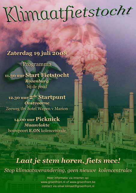 Uit protest tegen de bouw van een nieuwe kolencentrale stappen buurtbewoners en GroenFront!-activisten morgen op de fiets. Aangevoerd door een met trapkracht aangedreven SoundSystem voert de fietstocht vanuit Rozenburg en Oost Voorne naar de bouwlokatie op de Maasvlakte. Voor de bouwpoort wordt een picknick gehouden en zijn er een aantal sprekers. Er worden - afhankelijk van het weer - 20 tot 50 fietsers verwacht. GroenFront!-activist Rutger: "De bouw van een kolencentrale is een aanslag op de klimaatambities van Rotterdam en op de luchtkwaliteit. Als er een ding als een paal boven water staat, is dat we moeten stoppen met ouderwetse steenkolen."  E.ON bouwt ook in Engeland, Belgie en Duitsland aan nieuwe kolencentrales, en overal stuiten ze op fel verzet. Rutger: "Ook hier gaan we alles uit de kast halen om te voorkomen dat ze die centrale ooit af krijgen."