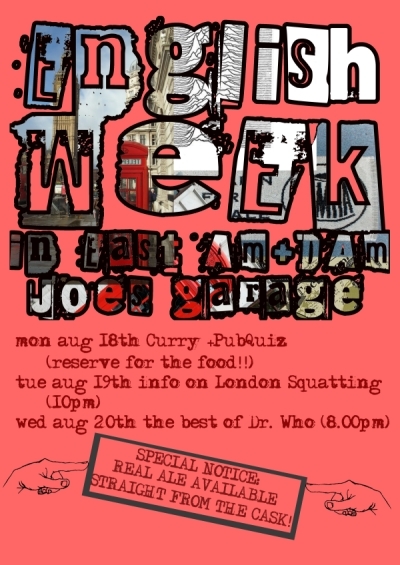[nl] [English below] Het Joes collectief heeft wat met Engeland. Sommigen komen er vandaan, anderen gaan er binnenkort heen verhuizen, vaak hebben we logees van over het kanaal, kortom tijd om dat eens goed in de verf te zetten. Op maandag staat de voku in het teken van "de engelse pub" met een heuse pubquiz en een typische curry. Joe's is open vanaf 19.00u. Pubquiz naar het eten, ergens naar 21.00u. Op dinsdag is er om 22.00u, na het KSU, een info avond over kraken in Londen. Op woensdagavond is het vanaf 20.00u tijd voor Dr. Who, we duiken de oude doos in voor een aantal legendariche alfeveringen. Dit alles wordt omkanderd door een vaatje Real Ale.  [en] The Joe's collective has a thing with England. Some people came from the island, others are moving there, we often have visitors from across the channel, it was about time to point this out. On Monday we have an "english pub" voku, with a real pub quiz and a typical curry. Joe's will be open at 19.00h; the pub quiz will start after the dinner, some time after 21.00h. On Tuesday, at 22.00h, after the squatting info hour, there will be an info evening on squatting in London. On Wednesday we start at 20.00h with a series of legendary Dr. Who episodes. A Cask of Real Ale is available during these activities. Joe's Garage - Amsterdam-Oost - www.joesgarage.nl Reserve food at: 020-4634380 |