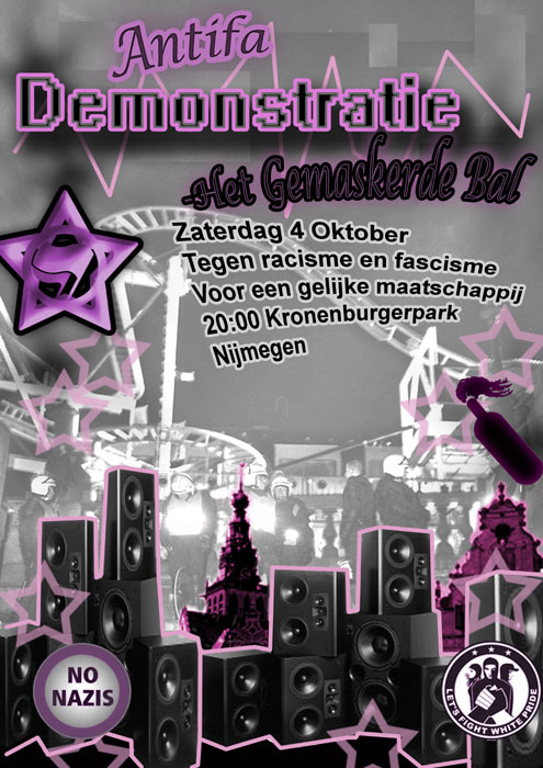 Nijmegen 4 Oktober 2008 20:00 Kronenburger Park Het Gemaskerde Bal Antifa Demonstratie tegen racisme, fascisme en politierepressie.  Wat zien wij? Steeds meer racisme. Steeds verdere verrechtsing van onze samenleving, jongeren die elkaar de hersens in slaan om een simpel verschil van huidskleur. De mensen worden verdeeld, omvergelopen en onderuitgehaald door de overheid, en de mensen met de macht staan er lachend bij. Nijmegen, een zogenaamd linkse gemeente, sluit haar ogen voor de problemen op de straat en wijgert iets te doen aan de grote verdeeldheid in de samenleving. Elk initiatief van verbroedring en samenleven word hardnekkig de kop ingedrukt, en moet plaats maken voor het grote geld. Wat willen wij? Een samenleving waarin de waardigheid en integriteit van elk mens gerespecteerd word. Waarin iedereen vrij kan leven en samenwerken, en waarin mensen zelf mogen beslissen hoe zij hun leven inrichten. En dit allemaal ten goede van de gewone burger, niet van het grootkapitaal en de machthebbers in deze wereld. Een samenleving waarin huidskleur, geslacht, afkomst, cultuur, sexualiteit en levenswijze niet een criterium is, maar een eigenschap. Hoe willen wij dat bereiken? Door samen sterk te staan, met z'n allen te vechten tegen diegene die ons deze vrijheden willen afpakken, van ons allemaal robots willen maken. Op deze dag willen wij duidelijk maken waar we voor staan, dat zaken als racisme, fascisme, sexisme, niet welkom zijn in de maatschappij. Want zij zaaien de verdeeldheid die ons allen, ten nadele komt. Vrijheid en mogenlijkheden voor allen, niet allen voor de mensen met macht! Wat doen wij dus? Wij organiseren een demonstratie in het hart van Nijmegen, omdat ook hier veel mensen hun ogen sluiten voor racisme, geweld, fascisme en neo-nazisme. Laat ook deze demonstratie een succesvol onderdeel zijn in de strijd tegen alles wat ons verdeeld, en dus onze vrijheid inperkt. Dit is een initiatief van individuen, los van organisaties en instanties. Iedereen is welkom! Stuur dit bericht door! Het Gemaskerde Bal ______________________ Antifa Demonstratie Nijmegen 4 oktober 2008 20:00 Kronenburgerpark Tegen Racisme, Fascisme, en Politie Repressie Be There! |