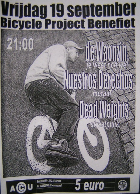 Benefiet Bicycle Project met De Waonzin, Nuestros Derechos, Dead Weights en dj Rups. Vrijdag 19 september in het ACU, Voorstraat 71 in Utrecht. Aanvang: 21.30 uur. Entree: 5 euro. De Waonzin staat weer op de planken!!! Waren die er niet helemaal mee gestopt zul je denken. Ja, dat klopt. Maar omdat ze het niet kunnen laten (en alle bandleden weer eens in de stad zijn op zoek naar veel, heel veel bier) zullen ze nog een keer het ACU op de kop zetten. Geheel in de traditie zullen ze het interieur van de zaal flink onder handen nemen en nemen ze ook nog eens twee extra bands mee! Waarschuwing is wel alvast dat het aanschouwen van deze metalheads geheel voor eigen risico is. Maar ja, je moet er wat voor overhebben. Last change. Do or die!!! Bevriende bands die optredens verzorgen zijn Nuestros Derechos en Dead Weights. Dj Rups zal tussen de bands de muziek verzorgen. Het is ook nog eens een politiek verantwoord feestje want de opbrengst van de avond is bestemd voor het Bicycle Project. Christiaan gaat ons van eind september tot juni volgend jaar verlaten om met zijn fiets van de Verenigde Staten naar Colombia te reizen. Daar zal hij diverse gemeenschappen en organisaties bezoeken die zich verzetten tegen de oprukkende vrije markt in Midden-Amerika. Voor diverse kranten, tijdschriften en websites zal hij berichten over het alledaagse verzet wat hij tegenkomt. De bedoeling van het project is om allereerst veel aandacht te vragen voor de situatie in het gebied en daarnaast om tot meer solidaire samenwerking te komen.