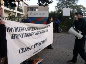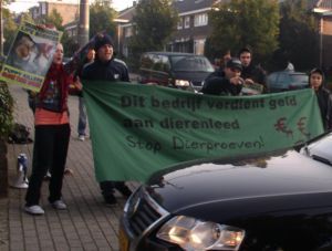 Vrijdag 26 september stond in het teken van protest tegen klanten van Huntingdon Life Sciences. Elke dag sterven 500 dieren als gevolg van de dierproeven die plaatsvinden in HLS. Apen worden onverdoofd opengesneden en vergiftigd met chemische stoffen. Beagle pups worden in het gezicht geslagen. Muizen, katten, ratten, konijnen, honden en apen worden vergiftigd, gepijnigd en vermoord in HLS. De dagelijkse hel voor dieren kan alleen plaatsvinden dankzij de steun van de bedrijven die op deze dag doelwit zijn geweest van onze protesten.     De dag begon om 7:30 met een protest bij het hoofdkantoor van Novartis in Arnhem. De medewerkers werden begroet op de welbekende SHAC stijl. Dit smerig bedrijf is al lang een klant van Huntingdon Life Sciences en is tegelijk ook een van de grootste klanten. Zij zijn ervoor verantwoordelijk dat jaarlijks 800.000 dieren de dood in worden gejaagd in de laboratoria van Huntingdon Life Sciences en in hun eigen laboratoria. Ze hebben vaak onderzoeksresultaten vervalst en ze zijn in staat van beschuldiging gesteld voor het omkopen van doktoren. We hebben deze dierenbeulen vandaag geconfronteerd met het dierenleed waar zij voor verantwoordelijk zijn. We zullen nooit de andere kant op kijken terwijl weerloze dieren sterven in HLS. Wij volgden onze weg naar Actelion in Woerden. Actelion Pharma heeft in 2005 op verschillende momenten van HLS gebruikt gemaakt. Deze laffe dierenbeulen verscholen zich achter luxaflexen terwijl wij voor het kantoor stonden. Het laat zien hoe trots deze mensen zijn op het werk wat zij doen. Het laat zien wat zij hebben te verbergen. Wij weten met wat voor smerige zaakjes zij bezig zijn, en wij zullen de mensen laten weten waarmee jullie bezig zijn. Actelion betaalt HLS zodat zij dieren kunnen martelen en vermoorden. Het is onvergevelijk en een absolute schande. Wij zullen terug blijven komen naar jullie kantoren, zolang jullie met HLS samenwerken! Daarna was het tijd voor een protest bij Bristol Myers Squibb. Wij confronteerden deze dierenbeulen met de zieke business die Huntingdon Life Sciences heet. Een grote klant als Bristol Myers Squibb is verantwoordelijk voor het leed wat zich dagelijks afspeelt in HLS. Zij waren niet blij om ons te zien. Ze hebben van te voren geklaagd bij de overheid om ons protest te voorkomen. Dit had geen effect, want wij stonden daar voor de deur om op een luide manier duidelijk te maken wat voor een ziek bedrijf Bristol Myers Squibb is. Wij zullen vechten voor de dieren die nu de dood in worden gejaagd. Het is wat wij deze dieren verschuldigd zijn. We zullen blijven terugkomen zolang jullie samenwerken met HLS. Deal with Huntingdon, deal with us! Aangezien wij wat tijd overhadden, besloten wij om Phenomenex te plezieren met een onaangekondigd bezoek. Dit bedrijf levert producten en diensten aan HLS. Uit documenten blijkt dat zij een belangrijke schakel zijn in de bedrijfsvoering van HLS. Dankzij Phenomenex kan HLS dieren vergiftigen, pijnigen en vermoorden. Phenomenex heeft HLS niet nodig, terwijl die diensten en producten van Phenomenex essentieel zijn voor het voortbestaan van HLS. Onze eis is dat jullie alle bande met HLS verbreken. Zolang Phenomenex zaken doet met HLS, zullen zij met ons te maken krijgen. Aan het einde van de dag was het tijd voor een van de grootste klanten van HLS, GlaxoSmithKline. Dit zieke bedrijf en haar werknemers werden aan de schandpaal genageld. Er is absoluut geen enkel excuus voor het leed wat Glaxo de dieren aandoet. Elke werknemer van dit bedrijf is bewust van hetgeen gebeurt achter de gesloten deuren van HLS. Vertel ons niet dat jullie niks weten van de beagle pups die in het gezicht gestompt worden. Vertel ons niet dat jullie niks weten over de apen die onverdoofd worden opengesneden. Vertel ons niet dat jullie niks weten over de dieren die massaal vergiftigd en vermoord worden. Jullie werken willens en wetens mee aan het dierenleed wat plaatsvindt in HLS. Voor GlaxoSmithKline zijn woorden als medeleven niks waard. Ze hebben geen enkel respect voor leven. Het is dan ook geen verassing dat dit bedrijf te maken heeft met verschillende aanklachten vanwege de bijwerkingen van de medicijnen die zij op de markt brengen. Paxil, een antideppressivum, bleek ongelofelijk onveilig te zijn, en veroorzaakte een verhoging in de zelfmoordneigingen van jonge volwassenen. Onbetrouwbare dierproeven en het verschuilen van onderzoeksresultaten zorgen ervoor dat deze gevaarlijke medicijnen op de markt kunnen komen. Het is duidelijk waar GlaxoSmithKline voor staat: het verdienen van geld. Zelfs al gaat dit gepaard met de dood van dieren in dierproefcentra, en de dood van mensen die sterven als gevolg van de bijwerkingen van de medicijnen van GSK. We zullen nooit toleren dat jullie geld verdienen over de ruggen van de muizen, ratten, katten, apen en honden die in HLS de dood in worden gejaagd! Zie ook: http://www.shac.net/news/2008/september/16.html |
