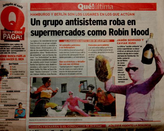In April 2006, about 30 precarious superheroes took delicatessen from a gourmet supermarket in Hamburg and distributed them to people in need. The prosecution believes to have found one of the superheroes who participated in the action. Following a conviction in June 2006, the law suit is now moving to the court of appeal.  "funniest raids in German criminal history" In April 2006, about 30 precarious superheroes took delicatessen from a gourmet supermarket in Hamburg and distributed them to people in need. The prosecution believes to have found one of the superheroes who participated in the action. Following a conviction in June 2006, the law suit is now moving to the court of appeal. The appeal court will take place on Wednesday, October 8th, 9am, in the County Court Hamburg (Sievekingplatz 3), Room 345. (An extensive press release will follow). A reminder: In the morning of April 28th, 2006, precarious Superheroes took Champaigne, leg of venison and other delicatessen from the Gourmet-Supermarket “Frische-Paradies” at Große Elbstraße, Hamburg. Subsequently, Spider-Mom, Superflex and their combattants set about to redistribute the goods. The delicatessen were discreetly transferred to daycare-teachers, interns, cleaning women and one-euro jobbers (unemployed who are forced to work for one Euro per hour). Why shouldn't precarious workers, who are increasing in numbers, participate in the abundant wealth of the city of Hamburg? The police responded to “possibly the funniest raids in German criminal history” (The Guardian) with aimless and legally dubious house searches. Nevertheless, the defendant was convicted at first instance. In the appeal court, the recriminations are based on no less absurd evidence. This time, it is not a dark pony tail, which allegedly points to the participation of the defendant in the action. Rather, the focus is on the documents on her laptop, which are amongst other things dealing with the topic of precarisation. This term has been subject to academic debate and media interest for more than ten years. As early as 1996, the Friedrich-Ebert-Stiftung organised a conference about precarisation. Today, Google displays 46000 hits for the respective search key. Peter Bremme from the German trade union for the service industry Ver.di and head of the department for special services, said: “If the preoccupation with the topic of precarisation would be enough to convict someone in court, this would put the trade unions under general suspicion. Especially in the department for special services, precarisation is is a core issue.” Sabine Dittmar from EuroMayDay Hamburg explains: “A conviction based on the use of the term precarisation would be tantamount to an attempt to criminalise societal debates.” Links:
