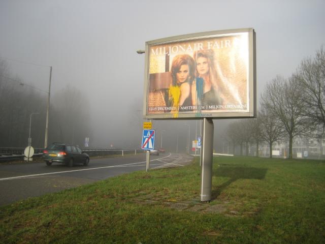waarop groot reclame werd gemaakt voor de miljonairsbeurs die volgende week donderdag in de Amsterdamse RAI plaats gaat vinden. bij de volgende plekken zijn ze gegooit: Amstelveenseweg, de Utrechtsebrug en de A2.