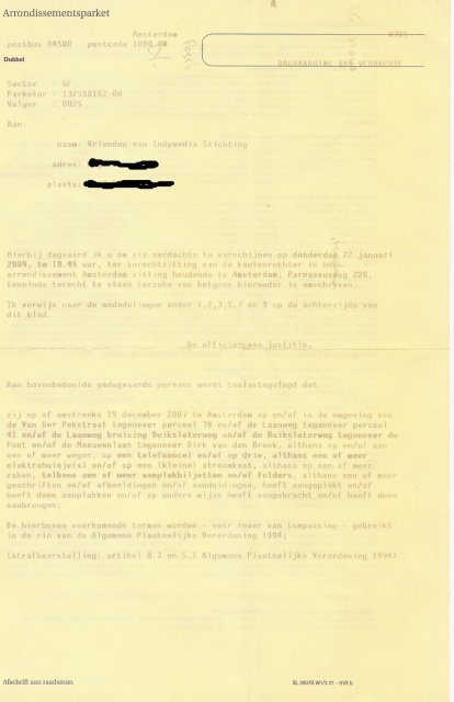 Update: Rechtszaak: Donderdag, 22 Januari, 10.45 uur, Parnassusweg 220 Neemt posters, plaksel en laptops mee (zodat je de rechter het verschil tussen het een en het ander kan uitleggen).  Het zielige carbonnetje (zie plaatje), waar nog wat andere onzin op gekriebeld staat en dat geen enkele officier van justitie de moeite vond om te ondertekenen, werd zonder aanbellen door de bus gedouwd. Je zou toch denken dat ze voor zo'n leuke grap nog voldoende trots aan de dag zouden leggen en een behoorlijk en netjes ondertekend document, met een identificeerbare OVJ, zouden opsturen en niet een als kladpapier gebruikt doorslagje. Het begon allemaal met een 1+1=3 e-mail van de milieupolitie. Na een hoop heen en weer getelefoneer leek betrokkene te begrijpen dat zijn redenering fout zat, waarmee de kous af had moeten zijn. Toch viel op 14 juli 2008 een transactievoorstel door de bus. Toen de redactie van "Nieuws uit Amsterdam" de milieupolitie in Amsterdam Noord om een reactie vroeg, kon de woordvoerder niet uitleggen op welke manier indymedia verantwoordelijk kan worden gehouden voor het ophangen van de affiches, zelfs al zou indymedia verantwoordelijk zijn voor info geplaatst door derden en al zouden dezelfde derden (wat ueberhaupt niet te bewijzen zou vallen omdat het posten op indymedia anoniem gebeurde) ook die posters hebben opgehangen in Amsterdam Noord. Het zou vast veel nuttiger zijn als het overtollige personeel een cursus nadenken zou gaan volgen, of de krant zou gaan lezen en niet, bovenop hun nutteloos bestede loon, nog meer belastingsgeld zouden gaan verspillen door een dagvaardig te sturen, terwijl ze tegenover de pers toegaven niet te kunnen uitleggen hoe indymedia verantwoordelijk zou kunnen gehouden worden. Deze verspilling van tijd en geld ten laste van de belastingbetaler, wordt verder gezet op donderdag 22 januari om 10.45u op de Parnassusweg 220 te Amsterdam (valt nog net uit het doorslagje te ontcijferen) Je komt er met tram 5 of metro 51 of met de treinen die stoppen bij Amsterdam Zuid. |