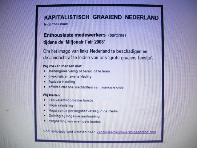 Miljonairsbeurs 11 Dec bestormen! nn - 03.12.2008 14:23 De poster waar nu heel amsterdam mee onder zit! De poster waar nu heel amsterdam mee onder zit! zie hier de oproep: http://indymedia.nl/nl/2008/11/56059.shtml | | Ook Pamela op feestje | VIP'er - 07.12.2008 20:05