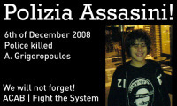 The day after the murder of the 16yo by the police and after a night of spontaneous demonstrations and fights with the police in various cities; a series of more organized demonstrations took place today. Thousands of people filled with rage and despair took the streets all over the country. Here are some brief reports. Athens: The demonstration started at 2.30pm, numbered up to 10,000 people and was very powerful. On the way to the police headquarter, numerous banks, governmental buildings, car dealers and fancy cars were attacked and destroyed and some were set on fire. When the demo came near the police headquarter, the road was blocked by riot police and the heavy fights started. The police used huge amounts of tear gas and that you could smell from miles away and the demonstration broke in smaller parts. The cops were running after some small groups. Others stayed and fought back. The part that managed to reach the police headquarter was brutally attacked by the cops, that was around 5pm. From that point on many of the small or bigger groups were fighting the cops in the alleys and head to the universities. 2 more police stations were attacked with rocks and petrol bombs. Fights with the police were taking place on and off around the 3 major universities in downtown athens until midnight while police (plain, riot and undercover cops) are everywhere. There are many people arrested (exact number not known yet) and many people hurt by the cops. Witnesses say that people were beaten up by the cops after being arrested and handcuffed. http://athens.indymedia.org/front.php3?lang=el&article_id=934936 http://athens.indymedia.org/front.php3?lang=el&article_id=934909 Thessaloniki: The demonstration numbered around 2000 people and on its way 2 police stations were attacked with rocks and petrol bombs. Banks and a ministry were also attacked. There were fights on many occasions, during and after the demonstration. After a point the fights were taking place around the university and kept going for a long time. The police used tear gas and also fired rubber bullets and hit a demonstrator and had to hospitalized. Volos: The demonstration was heading to the central police station when it found the street blocked by the riot police. Fights broke out and stones and other things were thrown to the cops. The police fired tear gas and the demonstration broke in two. Around 15 banks were smashed. Patras: The demonstration head to the central police station were the riot cops were waiting. Fights started, rocks were thrown to the cops which threw tear gas in return and garbage cans were set on fire. A car near the police station was set on fire. Banks were also attacked and had their windows smashed. 5 people were arrested. http://patras.indymedia.org/front.php3?lang=el&article_id=2646 http://patras.indymedia.org/front.php3?lang=el&article_id=2656 Iraklio: A demonstration of 600 people took place during which 10 or so banks were smashed. Afterwards there participants decided to class with the police, threw rocks and molotov cocktails and made fire barricades on the streets. The police responded with huge amounts of tear gas. People then headed to the central police station which was destroyed last night and attacked it again. Ioannina: 500 people demonstrated and classed with the police. All the banks on the demo route where smashed. Rocks were thrown to the riot cops. 3-5 people were brutally beaten by the cops and some of them had to go to the hospital and get stitches. There might be 2 arrests Kavala: There was no demonstration but the central police station was attacked with rocks and petrol bombs. 3 banks were also smashed. Chania: 250 people headed to the central police station. On their way they attacked on a police bureau, a bureau of the government party and 2 banks. When they reached the police station they clashed with the riot police. Throwing rocks and sticks. They police used tear gas. Afterwards they attacked and broke the windows of 5-6 more banks. Corfu: The demonstrated of about 200 people reached the central police station where slogans were written on the walls and threw eggs, paint and other objects and smashed some of its windows. Mitilini: 150 people smashed some surveillance cameras, banks, a ministry and some more governmental buildings. Slogans were written on walls. Demonstrations took place in other smaller cities such as Kozani, Arta, Tripoli where the people confronted with the police and slogans were sprayed on walls. A new round of demonstrations is arranged for tomorrow, Monday, in Athens, Thessaloniki, Patras, Karditsa, Larisa, Korintho, Naxos, Arta, Chania and probably more. In some european cities, gatherings and demonstrations are organized, some in UK, Germany and Netherlands. | | pics of alexandros | c - 08.12.2008 02:48