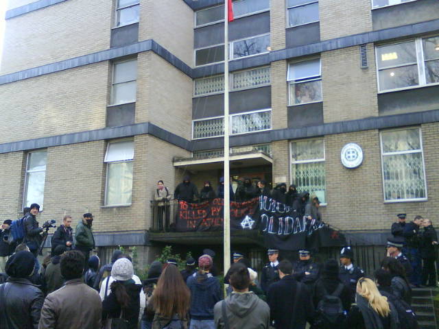 The Greek embasy in London is occupied by protestors , protesting against the murder of the 15years old Alexis in Athens yesterday by police.