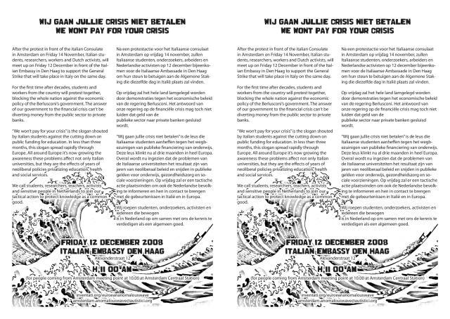 Op 12 december is er een grote staking in Italië en nieuwe krachtstoer van de daar demonstrerende en actievoerende studenten. Er is een solidariteitsactie in Den Haag. Om 11 uur bij de Italiaanse Ambassade (Alexanderstraat 12 Den Haag) Hierbij de flyer.