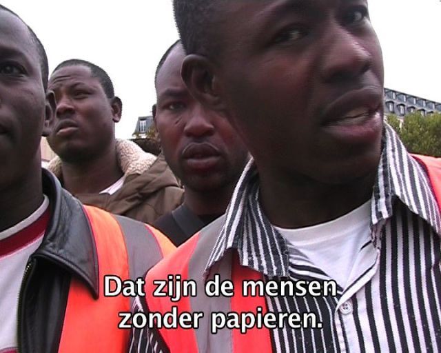 Fillipijnse, Duitse en Afrikaanse migranten praten over hun werk en werkomstandigheden tijdens en op weg naar een demonstratie voor eerlijk werk in Parijs.