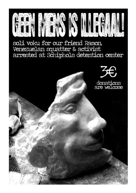 Solidarity vegan voku for Ramon, Venezuelan squatter and activist who is now in the Schiphol detention center. Today at Joe's Garage 19.00 H (Pretoriusstraat 43).