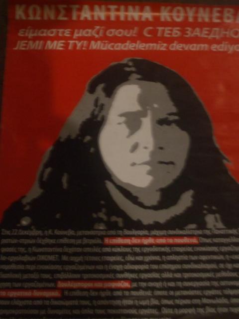 De naam van de Bulgaarse vrouw die werd aangevallen is Konstanina Kuneva. Meer over haar strijd voor een betere positie van de (immigranten) arbeider in Griekenland is o.a hier te vinden: www.clandestina.org Zie voor een eerdere solidariteitsactie in Thessaloniki: http://www.indymedia.nl/nl/2008/12/56710.shtml Website: http://www.clandestina.org | |