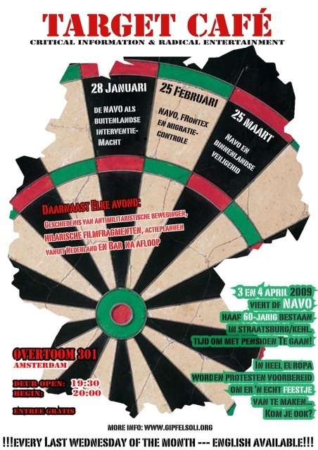 Op 3 en 4 april wordt het groot feest in Straatsburg, Baden-Baden en Kehl! Dan viert de NAVO haar 60ste verjaardag, maar activisten uit heel Europa komen ook naar de feest om de NAVO op pensioen te sturen. Hier een kort overzicht van de geplande acties en de NAVO programma.  Belangrijke data voor je anti-NAVO agenda: 14/15 februari: International Activist Conference, Straatsburg. Zie: http://www.wri-irg.org/node/6384 voor meer informatie. 16 februari: Studenten Infoavond STOP NAVO 2009, 20:30, Kraakschool, Schoolstraat 4hrs. Zie: http://www.indymedia.nl/nl/2009/02/57552.shtml 19-20 februari: Polen: Bijeenkomst van de ISAF (de NAVO missie in Afghanistan) en een bespreking van de toekomstige uitbreiding van de NAVO. 28 februari: Target café: De Peper, Overtoom 301, deuren open 19.30; 20.00 uur start. Zie: http://indymedia.nl/nl/2009/01/57114.shtml 21 maart: Nieuw Milligen: Internationale actiedag tegen de NAVO. Vanaf Apeldoorn en Arnhem rijdt er een bus naar het militaire domein. Voor reservatie voor de bus, mail naar ontwapen[at]hypocrisy.org. Zie: http://natogameover.org/dossier.php?id=87 31 maart: Bussen vertrekken uit Amsterdam naar Straatsburg... kom mee! Reserveer nu je plaats. email: natogameover[at]gmail.com Er is ook een infotour dat nu door heel Europa trekt. Zie: http://www.dissent.fr/node/79 NAVO top Straatsburg, Baden-Baden en Kehl: De officiële plannen voor de “Summit Meeting of NATO Heads of State and Government Strasbourg, France/Kehl, Germany” liggen klaar. De NAVO top begint vrijdag avond (03.04.09) met een gala avond en maaltijd in de Kurshaus Casino te Baden-Baden (Duitsland). De vergaderingen zelf zullen plaatsvinden in de Palais de la Musique et des Congres (place de Bordeaux, Straatsburg) van 10-15 uur. Ook de Palais Rohan wordt als vergader plek gebruikt Beide zullen binnen de afgebakende 'veiligheidszone' vallen. Belangrijke politici uit 35 verschillende landen, waaronder 26 officiële delegaties, zullen deze vergaderingen en de bijbehorende “NATO-Party” bijwonen. De delegaties zullen van vrijdag tot zaterdag in de regio overnachten. Tot hier toe is al bekend dat de delegaties uit Nederland, Duitsland, Bulgarije, Tsjechische Republiek, Estland, Hongarije, Italië, Litouwen, Polen, Republiek Slovenië, Turkije, Roemenië en Kroatië in Baden-Baden zullen overnachten en dat de delegaties uit België, Canada, Denemarken, Griekenland, Ijsland, Letland, Luxemburg, Noorwegen, Portugal, Spanje, Slovakije en Engeland zullen aan de Franse zijde van de grens overnachten. Het is nog niet bekend waar Barak Obama zal overnachten. Er zal ook een belangrijke fotoshoot plaatsvinden op de voetgangersbrug tussen Kehl en Straatsburg op zaterdag om 8.30 uur. Angela Merkel en Nicolas Sarkozy zullen elkaar dan op de grens tussen Frankrijk en Duitsland tegemoet komen. Kampen: Er zijn plannen voor twee grootschalige 'villages autogerés' waar activisten kunnen verblijven zo wel in Straatsburg als in Kehl. Het overleg met de staat gaat echter niet vlot. De autoriteiten willen alleen kleine kampen toestaan, niet groter dan 1,500 mensen per kamp en de activisten staan erop dat ze toestemming krijgen voor een kampeerterrein groot genoeg voor tussen de 10,000 en 18,000 mensen. De autoriteiten willen graag kleine kampen die overzichtelijk zijn en die zij gemakkelijk onder controle kunnen houden. Acties: Van 1 t.e.m. 5 april zullen verschillende acties plaatsvinden in en rond Straatsburg. Woensdag, 1 april: Acties rond de NAVO's nieuwe plannen voor een uitgebreid veiligheidsinfrastructuur. Lees zelf het nieuwe NAVO strategiepapier: http://www.csis.org/media/csis/events/080110_grand_strategy.pdf en: http://www.statewatch.org/news/2008/oct/against-global-security-architecture.pdf “April fool's day” acties in solidariteit met de Engelse activisten die de G20 top deze dag zullen protesteren. http://www.climatecamp.org.uk/g20 Donderdag, 2 april: verschillende acties gepland, waaronder acties tegen wapens bedrijven, DHL (Duitse post bedrijf sterk betrokken bij oorlog logistiek, http://www.gipfelsoli.org/Home/6009.html) en Commerzbank. Vrijdag, 3 april: Acties tegen NAVO gala-avond in Baden-Baden. Nadere info volgt. Zaterdag, 4 april: Actie op de voetgangersbrug tegen de fotoshoot tussen Merkel en Sarkozy. Gevolgd door blokkades van de top zelf en een grote betoging in de namiddag (13 uur). Zondag, 5 april: Solidariteitsacties met eventuele gevangen. Veiligheidsdiensten/plannen: De NAVO top wordt de grootste veiligheidsoperatie ooit in de regio Baden-Wurttemberg. Er is sprake van tussen 15.000 en 16.000 veiligheidsdiensten. Deze zullen ondergebracht worden in verschillende sportcentra, jeugdherbergen en hotels in de regio. De stad Straatsburg heeft al laten weten dat zij van plan zijn om de grens dicht te houden tijdens de NAVO top. Ook de haven zal de hele week stilliggen. In Straatsburg, Kehl en Baden-Baden zullen er verschillende 'red zones', afgebakende 'veiligheid' zones opgericht worden. Maar de verantwoordelijke voor de veiligheidsoperaties beweert dat zij in baden-baden geen muur zullen bouwen. De huidige plannen houden echter in dat iedereen die naar Baden-Baden komt tegen gehouden zal worden door politie en op een politiebegeleiding kan rekenen indien toegelaten Baden-Baden binnen te treden. Er is ook sprake van een veiligheidsalarm. Alle straten binnen een omtrek van 80km rond Baden-Baden zullen vrij gehouden worden. Meer informatie: Hier vind je een internationale oproep tegen de NAVO top die al breed gesteund wordt: http://stopdenavo.blogspot.com/2008/11/internationale-oproep-zoals-besloten-in.html Lokaal autonoom actienetwerk: http://natogipfel2009.blogsport.de Achtergrond en veel kaartmateriaal op: http://www.gipfelsoli.org Nederlands platform met o.a. de Internationale Socialisten: http://stopdenavo.blogspot.com/ Plannen voor een bestorming van het NAVO hoofdkwartier in België: www.vredesactie.be Internationale Mailinglijst: https://lists.riseup.net/www/info/nato2009 Diss