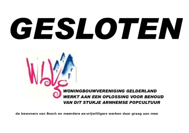 Na 5 jaar ups en downs werd het Kultuurhuis van Hotel Bosch Arnhem door de Woningbouw Vereniging Gelderland (WVG) gesloten. Zij zeggen dat ze een nieuwe huurder zoeken, maar hoe lang de sluiting zal duren is onbekent. Leeg is leeg en leegstand is onaanvaardbaar in de traditie van Hotel Bosch. De WVG argumenteerd met oplopende huurachterstand. Dit betekend dat ze niets voor niets kiezen. Dus als zij de toegang ontzeggen, dan ontvangen ze zeker geen huur! Dus het verschill is alleen dat nu de broedplaats voor alternatiefe groeperingen in Arnhem niet meer beschikbaar is.  leegstand is NIET aanvaardbaar PERSBERICHT (van de Woningbouw Vereniging Gelderland) KULTUURHUIS BOSCH sluit de deuren WBVG neemt initiatief tot nieuwe exploitant Kultuurhuis Bosch heeft per direct haar deuren gesloten in afwachting van het faillissement van de stichting die het Kultuurhuis de afgelopen vijf jaar heeft geëxploiteerd. Het personeel is vandaag op de hoogte gebracht. In de afgelopen maanden heeft op initiatief van verhuurder WBVG een onderzoek plaatsgevonden naar de problemen waar de stichting in verkeerde en is er gekeken naar mogelijkheden voor een doorstart. Aanleiding hiervoor was een oplopende huurachterstand. De stichting heeft moeten concluderen dat de bedrijfsvoering niet op orde was en dat de financiële situatie zo ernstig was dat het tij niet meer gekeerd kon worden. Om die reden heeft de stichting de deuren per 12 februari gesloten en is de huurovereenkomst opgezegd. Verhuurder Woningbouwvereniging Gelderland (WBVG) neemt nu het initiatief om een passende exploitant te vinden. Het voormalige krakersbolwerk Hotel Bosch is in 2003 omgetoverd tot een bijzonder pand dat door een bewonersvereniging wordt beheerd. Op de verdiepingen wonen 12 mensen en op de begane grond werd huisvesting geboden aan sociale, culturele en politieke activiteiten in de vorm van een café, een theaterzaaltje en een concertzaal, bekend als Kultuurhuis Bosch. Doel van het project was aan te tonen dat bewoners vanuit eigen verantwoordelijkheid en eigen keuzes kunnen komen tot volwaardig mede-opdrachtgeverschap. Het project is vijf jaar geleden geheel volgens dat plan gerealiseerd. De WBVG trok zich terug in haar verhuurdersrol en heeft het dagelijks beheer overgedragen aan de bewoners. Het Kultuurhuis had een specifieke plaats in het culturele aanbod in Arnhem. Termen als broedplaats en subcultuur zijn op het Kultuurhuis van toepassing. Het Kultuurhuis draaide met behulp van de inzet van tientallen vrijwilligers en deed geen beroep op structurele gemeentelijke subsidies. Vijf jaar Kultuurhuis Bosch laat een culturele geschiedenis achter die onmiskenbaar haar waarde heeft bewezen voor de buurt en voor de stad. De WBVG betreurt de gang van zaken en vindt het wenselijk dat de bijzondere broedplaats- en aanjaagfunctie voor de stad behouden blijft. Nu het Kultuurhuis beschikbaar is voor verhuur stelt de WBVG als verhuurder zich ten doel de accommodatie te verhuren aan een huurder die recht doet aan de identiteit zoals hierboven omschreven. De nieuwe huurder zal door middel van het culturele aanbod een verrijking voor Arnhem moeten betekenen, zich moeten kenmerken door een professionele en bestendige aanpak en voortvarend te werk moeten gaan in de nieuwe opzet voor het Kultuurhuis. Het initiatief voor het nieuwe Kultuurhuis ligt in handen van de WBVG. Zij wil de bestaande Arnhemse cultuurinstellingen betrekken bij het ontstane gat in het aanbod en in goede samenwerking uiteindelijk met de juiste partner(s) deze kans oppakken. WBVG |